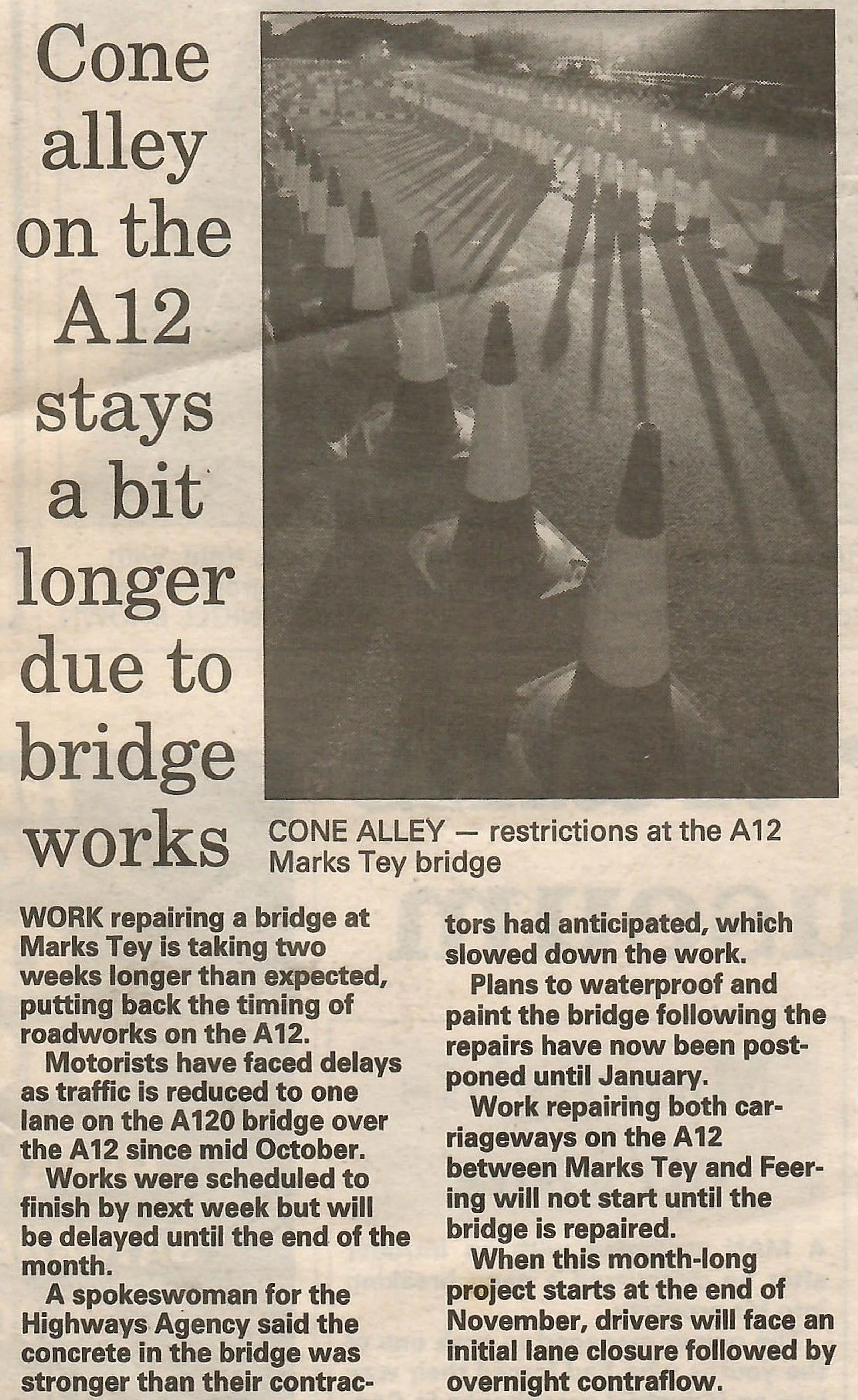 Cone alley on the A12 stays a bit longer due to bridge works