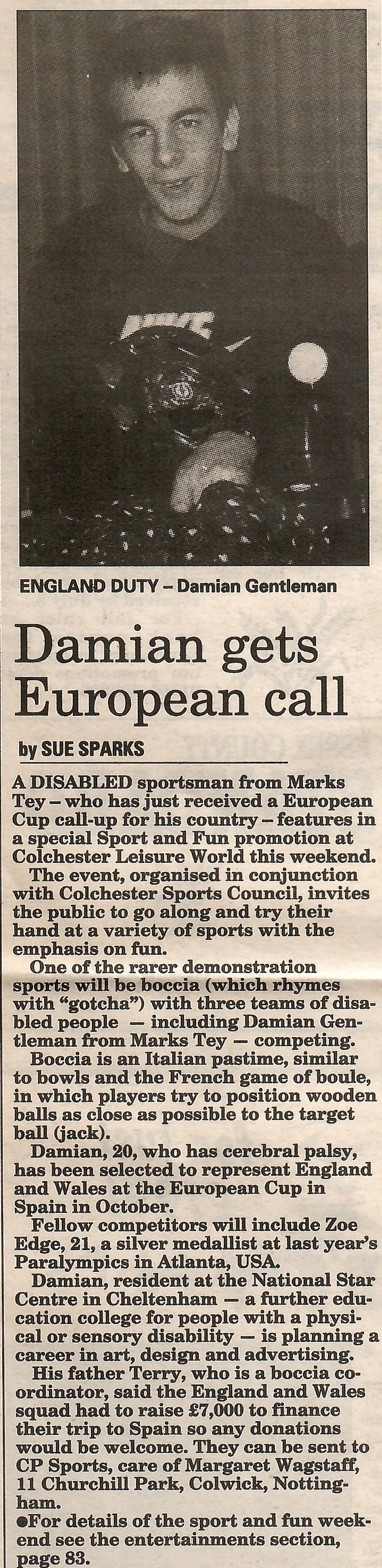 Newspaper photograph and report regarding Damian Gentleman competing in the European Cup for Boccia.