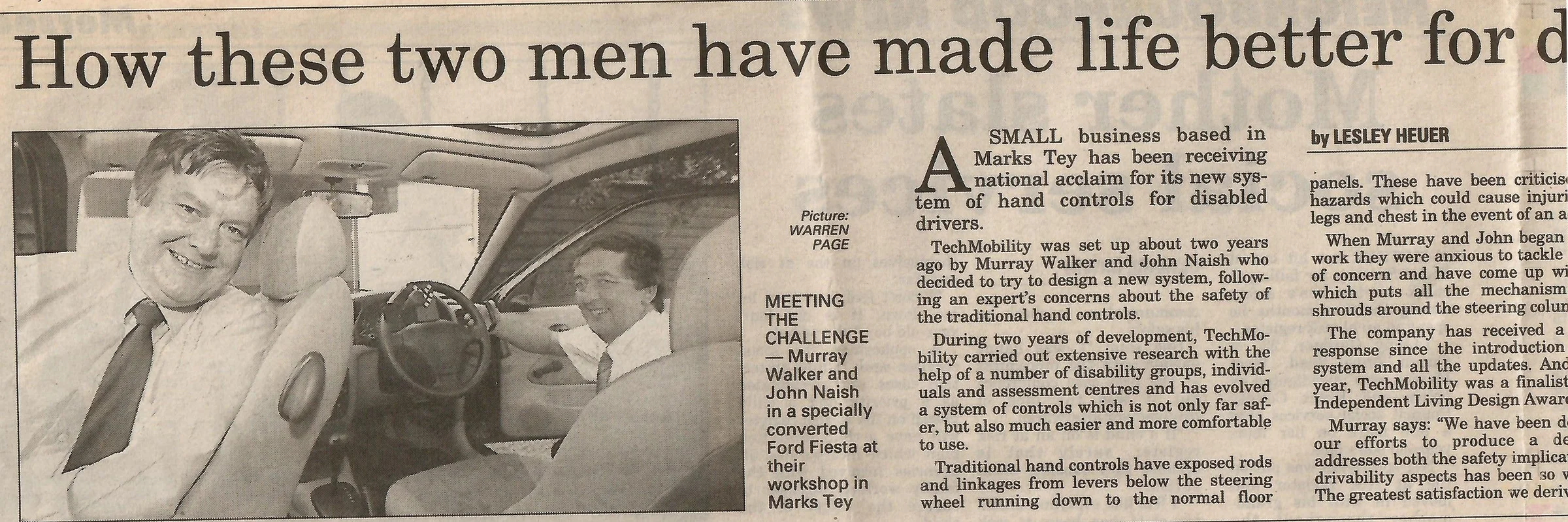Newspaper photograph and report regarding the TechMobilty company in Marks Tey run by Murray Walker and John Nash.