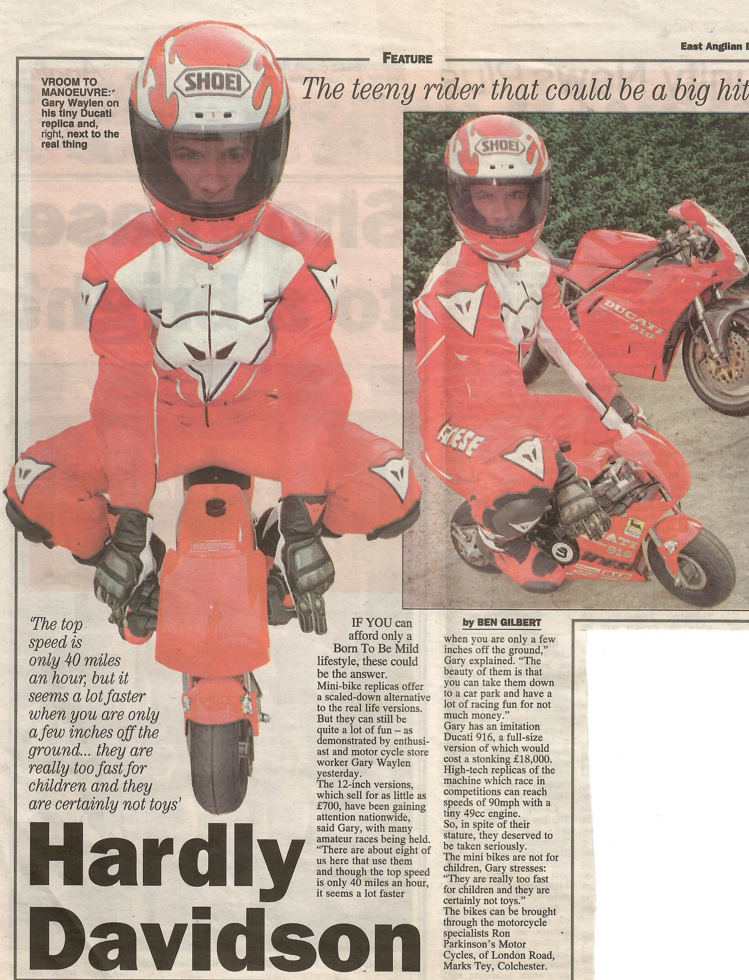 Newspaper photograph and article on mini-bikes sold by Ron Parkinson's Motor Cycles.