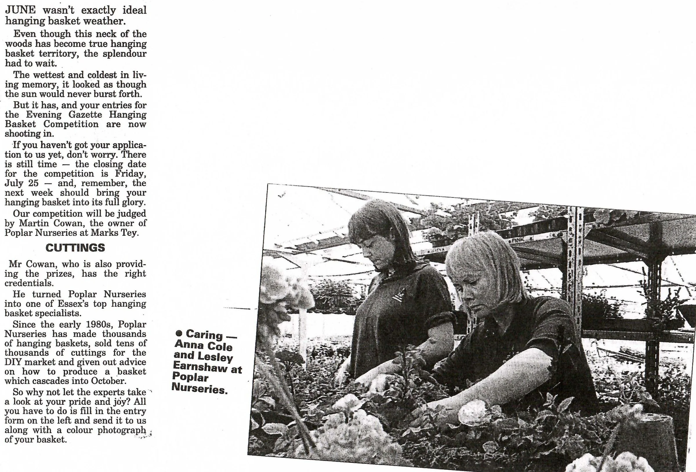 Newspaper photograph and report on hanging baskets at Poplar Nurseries.