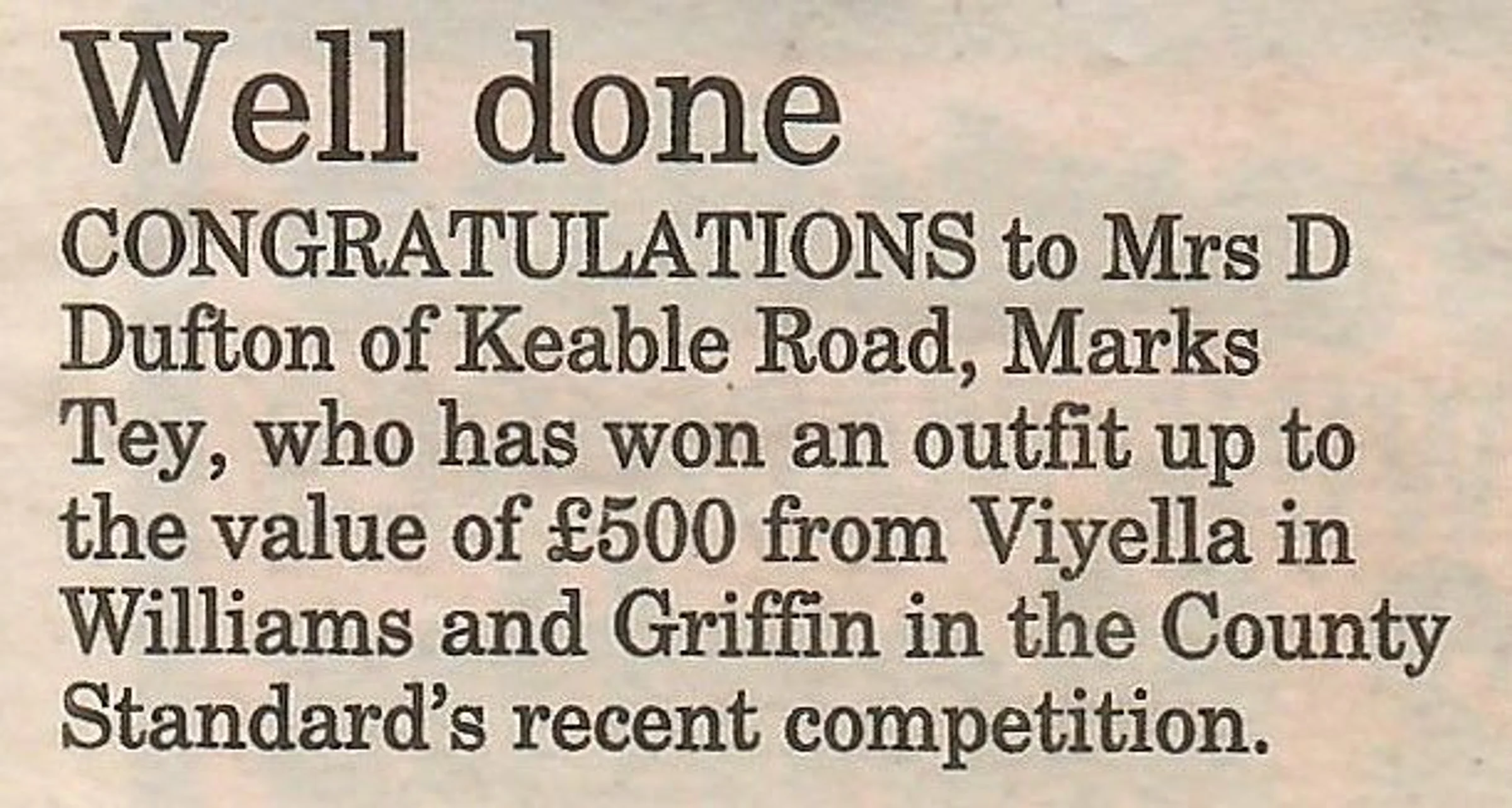 Newspaper report regarding competition winner Mrs D. Dufton.