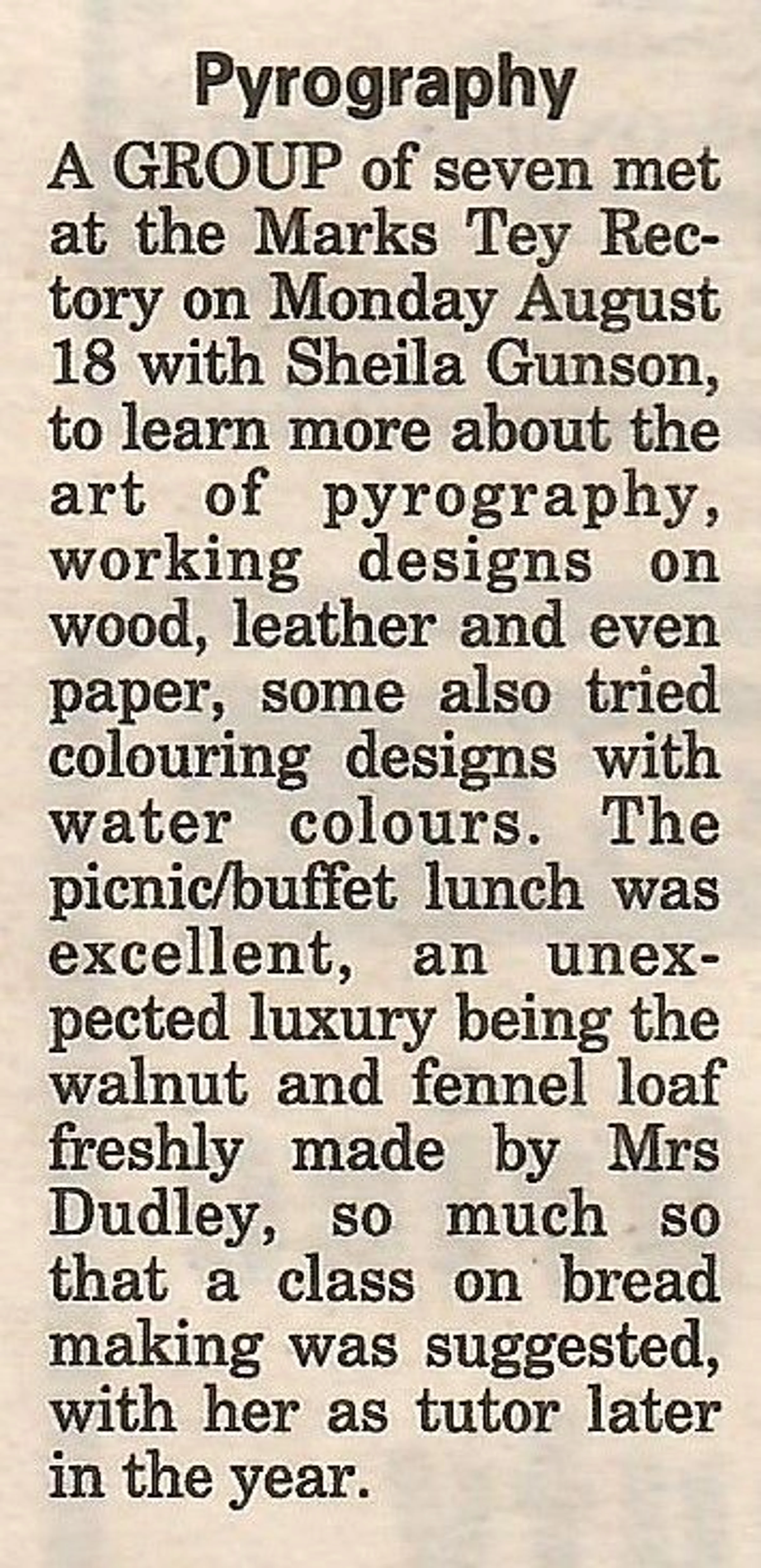 Village news column reporting on a pyrography class.