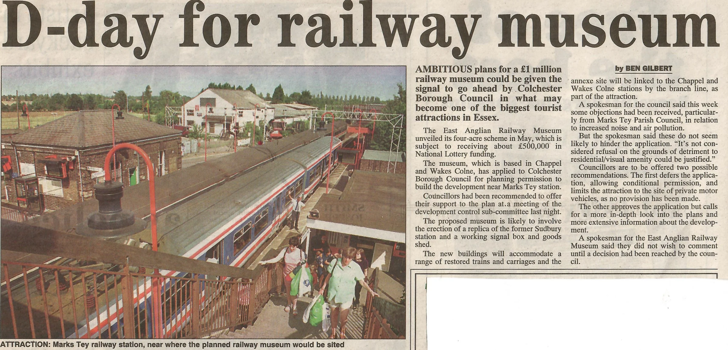 Newspaper photograph and report regarding plans for a museum at Marks Tey Station.