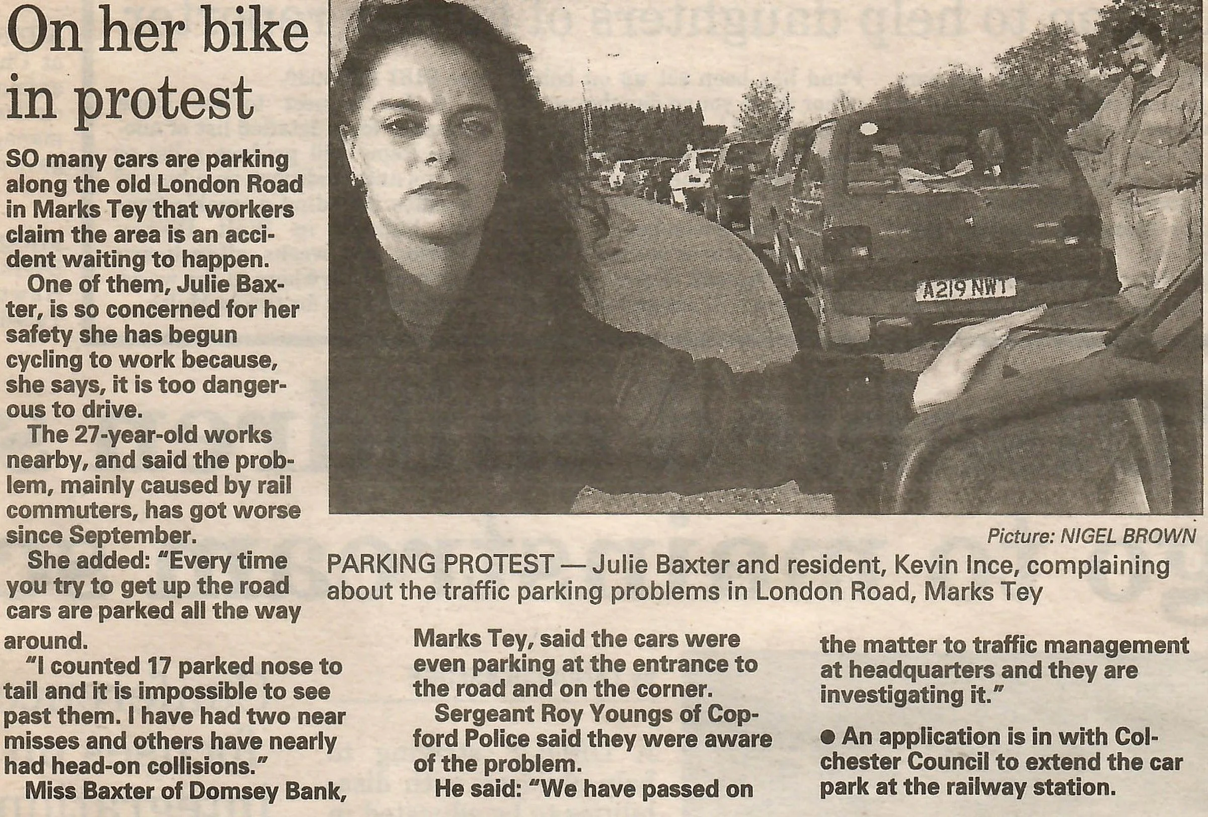 Newspaper photograph and report regarding car parking along Old London Road for Marks Tey Station.