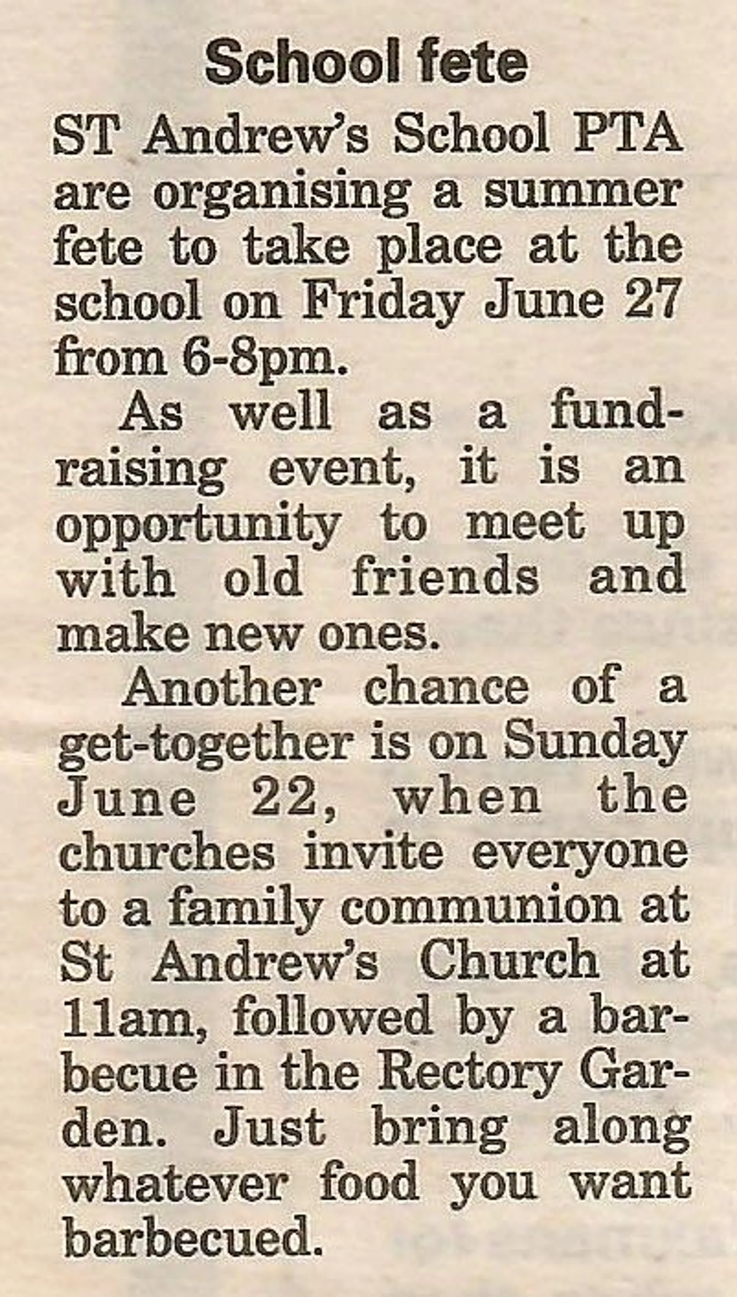 Village news column regarding the school fete and church barbecue.
