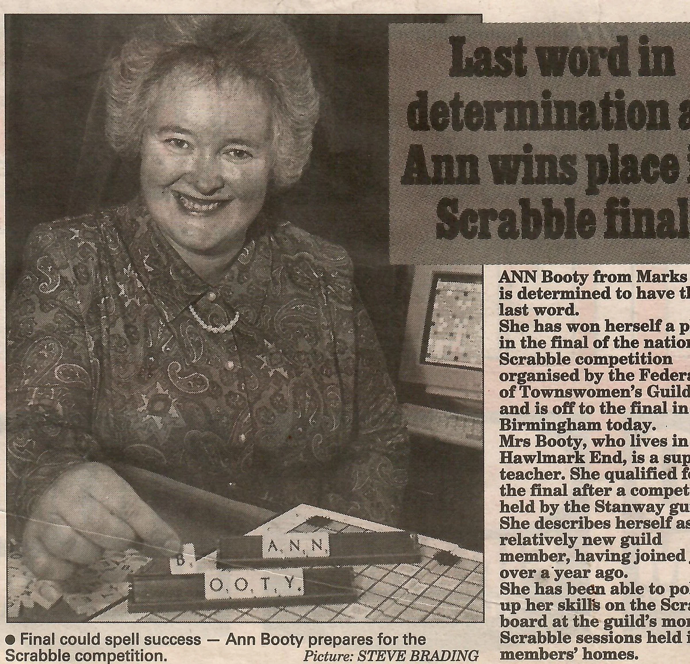 Newspaper photograph and report regarding Ann Booty's participation in the final of a national Scrabble competition.