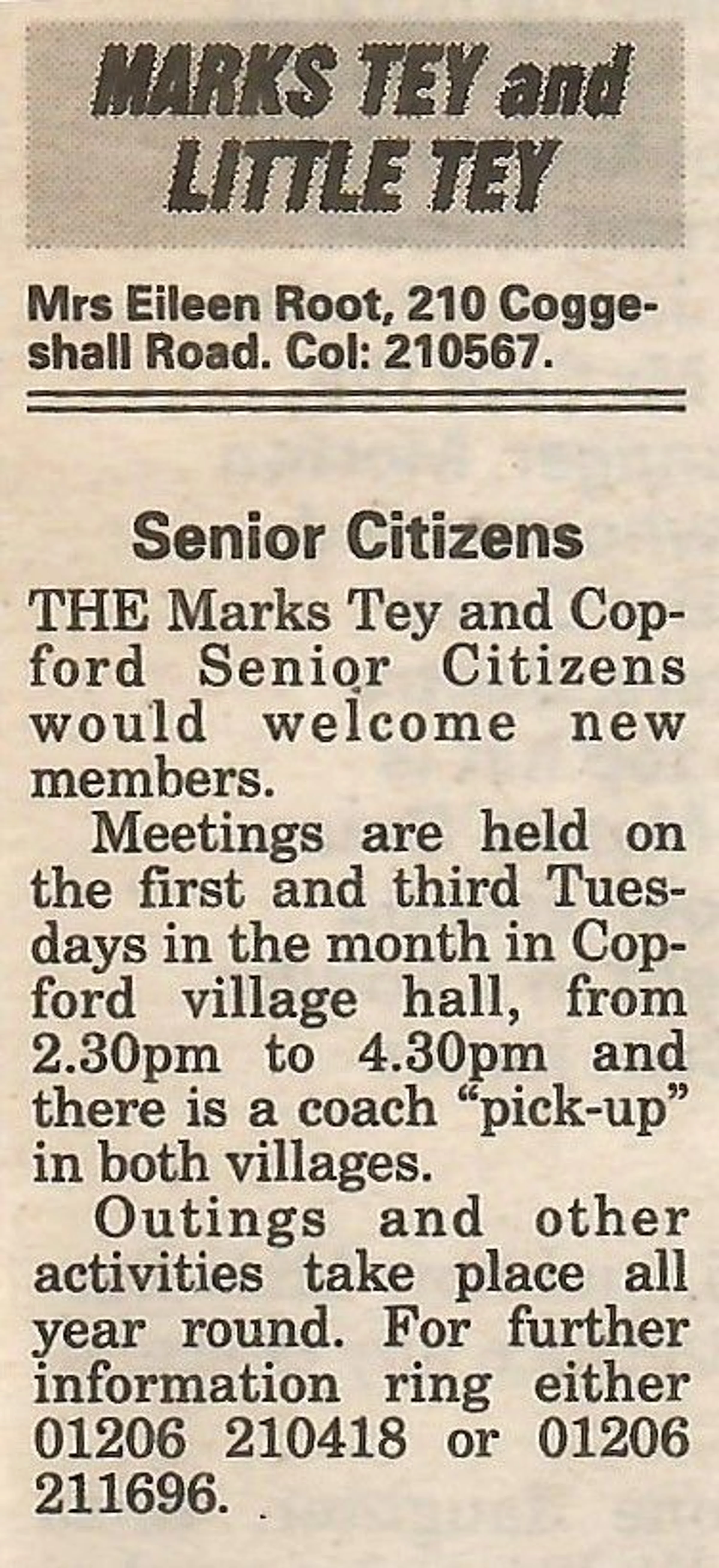 Village news column inviting new members to the Marks Tey and Copford Senior Citizens club.