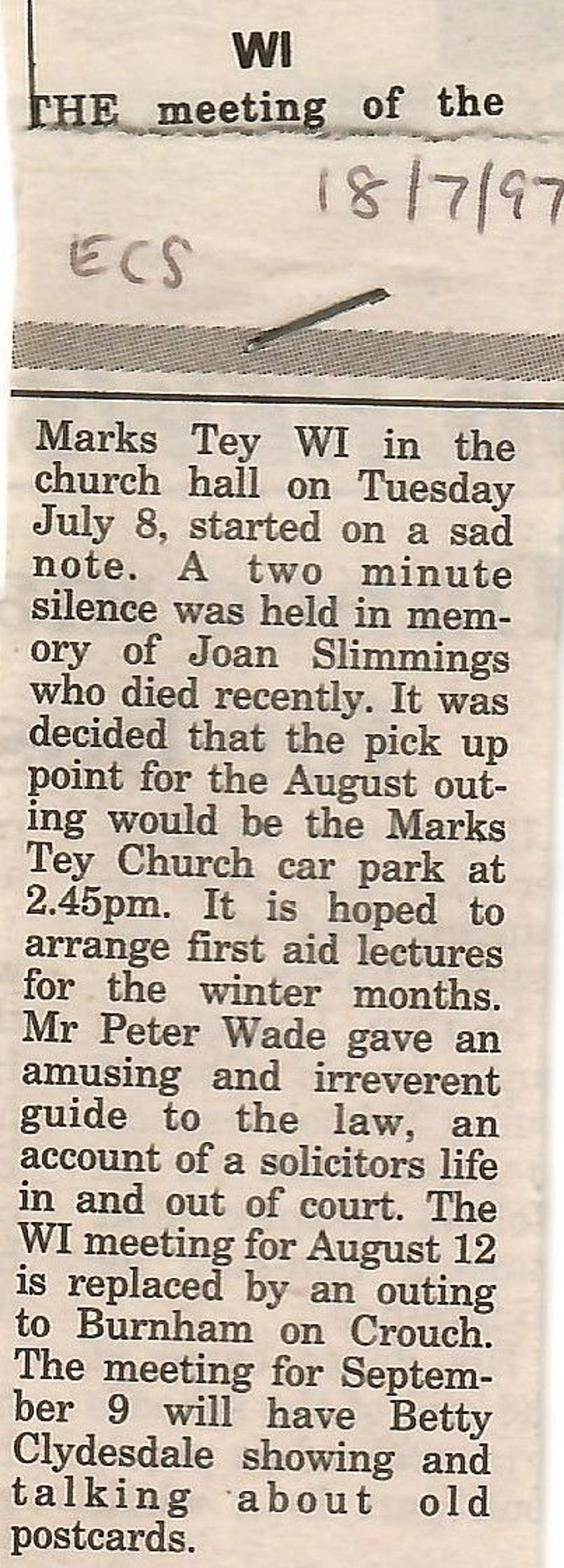 Local news column reporting on the July meeting of the Women's Institute.