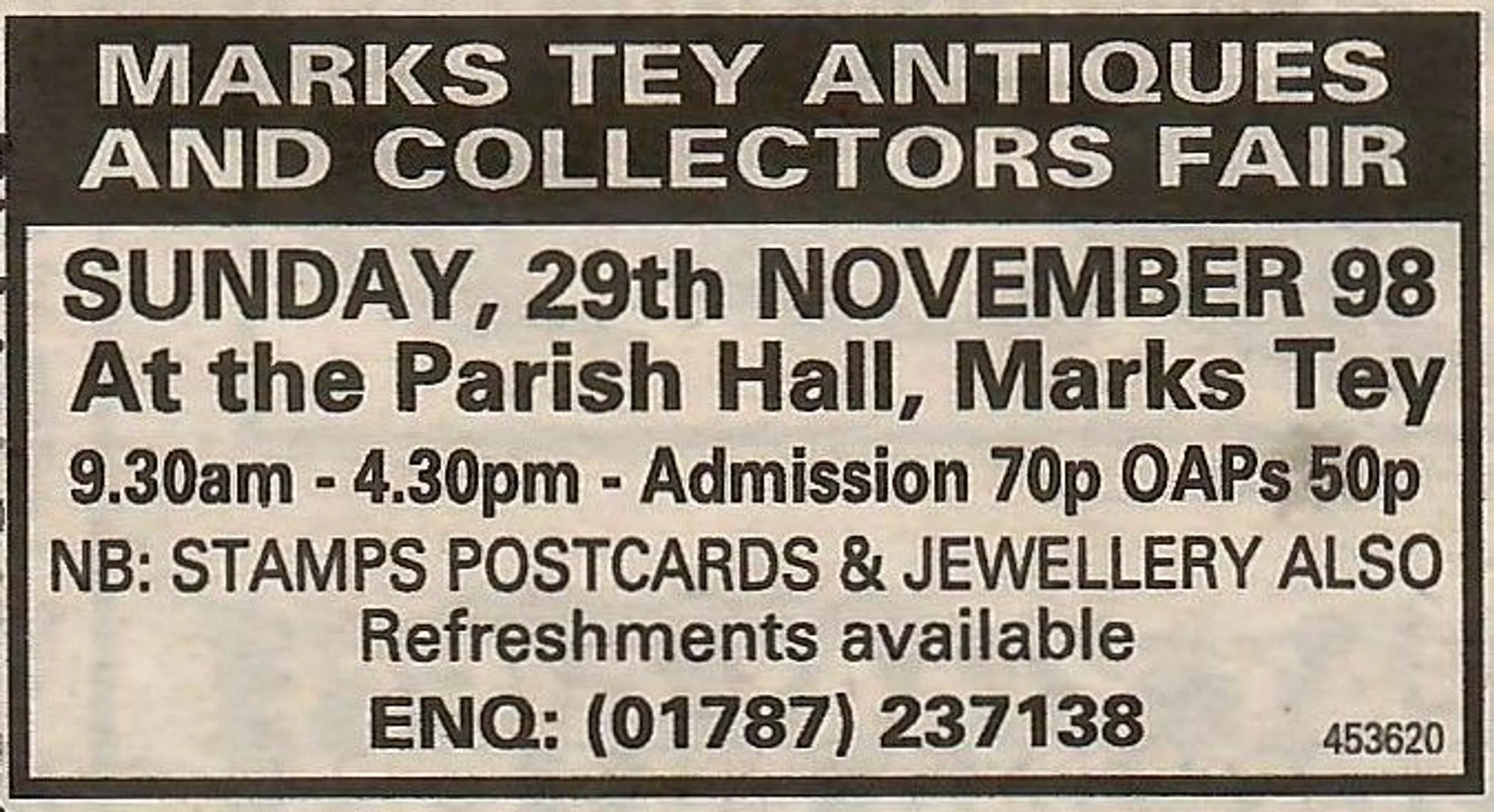 Advertisement for an antiques fair.