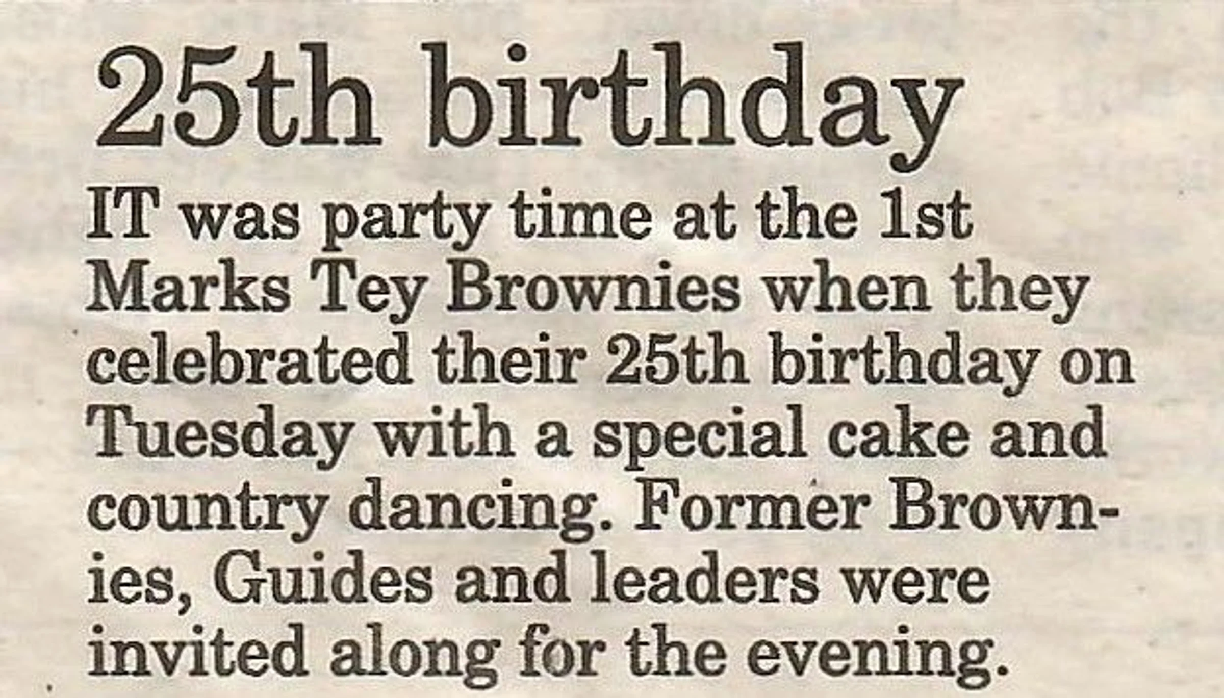 Article reporting the 25th birthday of the 1st Marks Tey Brownies.