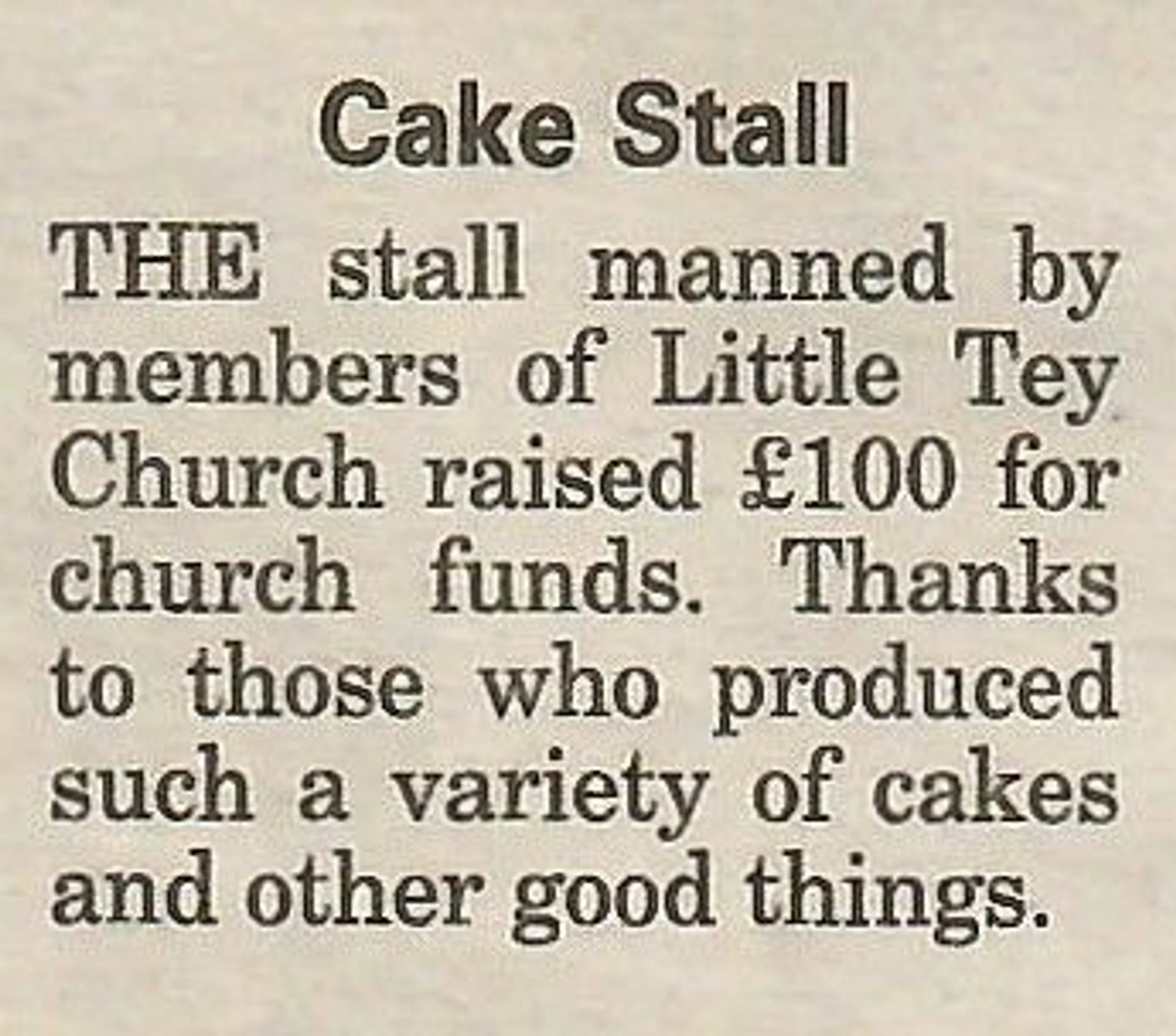 Village news column reporting on the Little Tey Church cake stall.