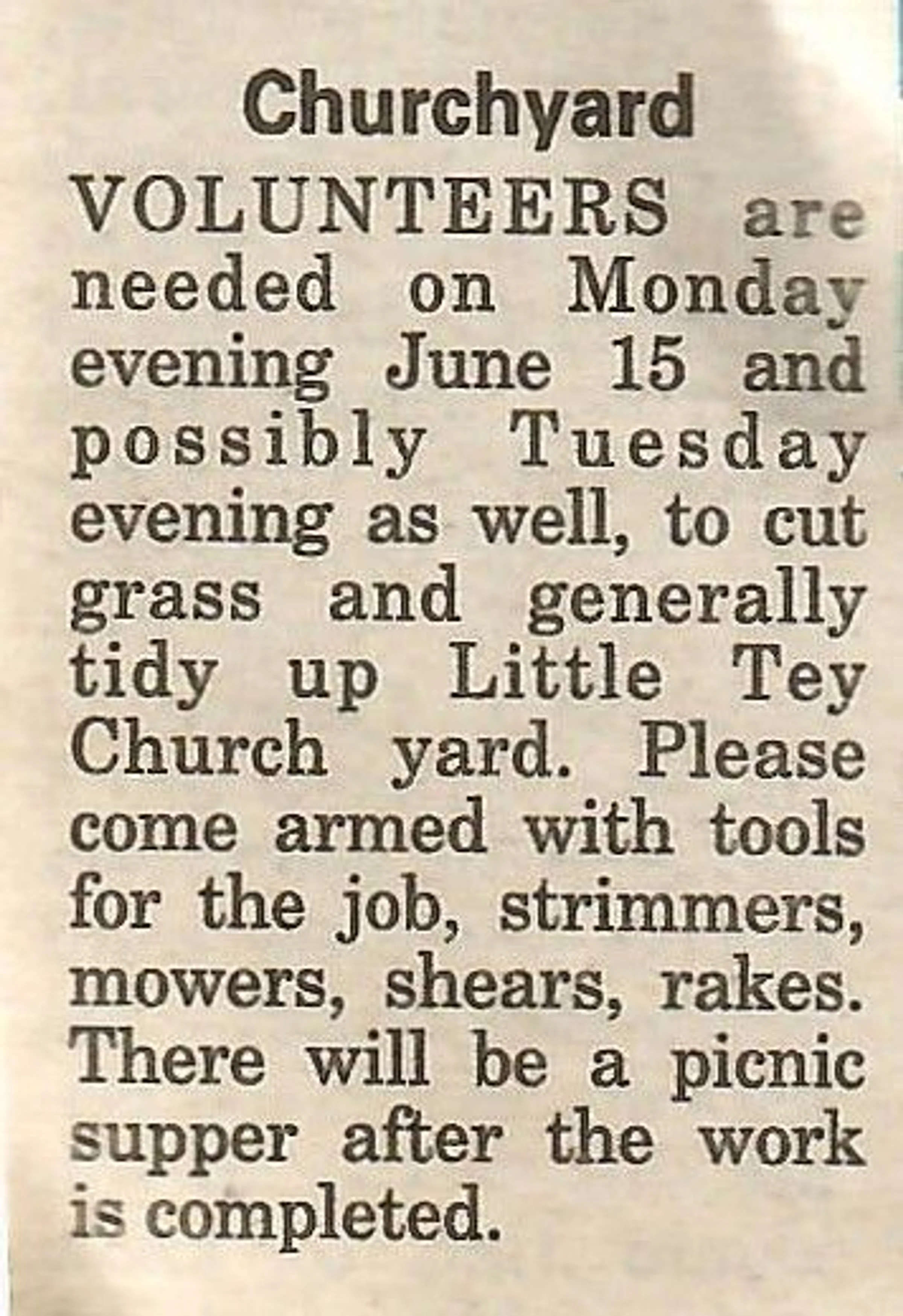 Village news column calling for volunteers for tidying the churchyard at Little Tey.