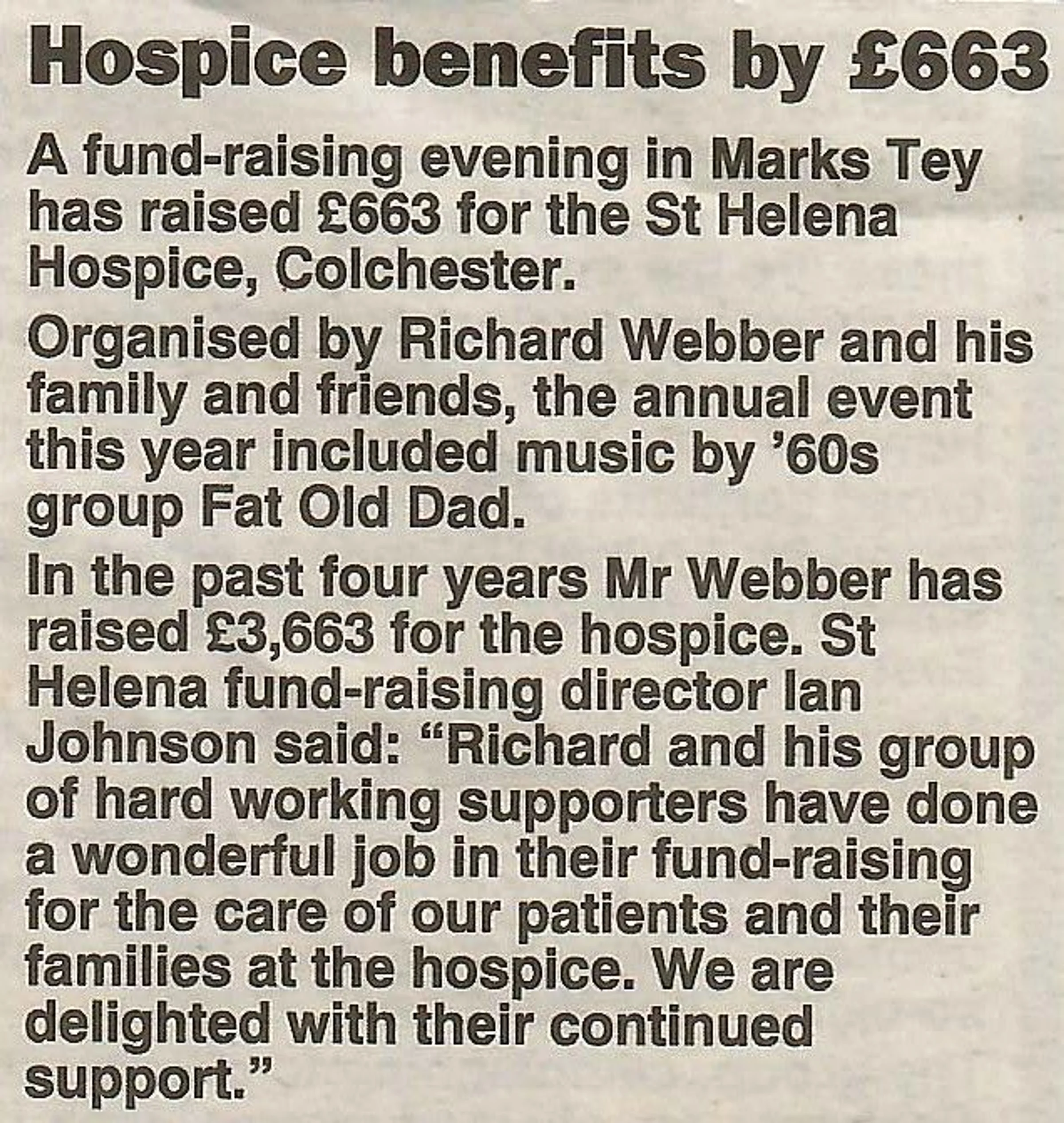 Newspaper report regarding a fundraiser for ST Helena Hospice by Richard Webber.