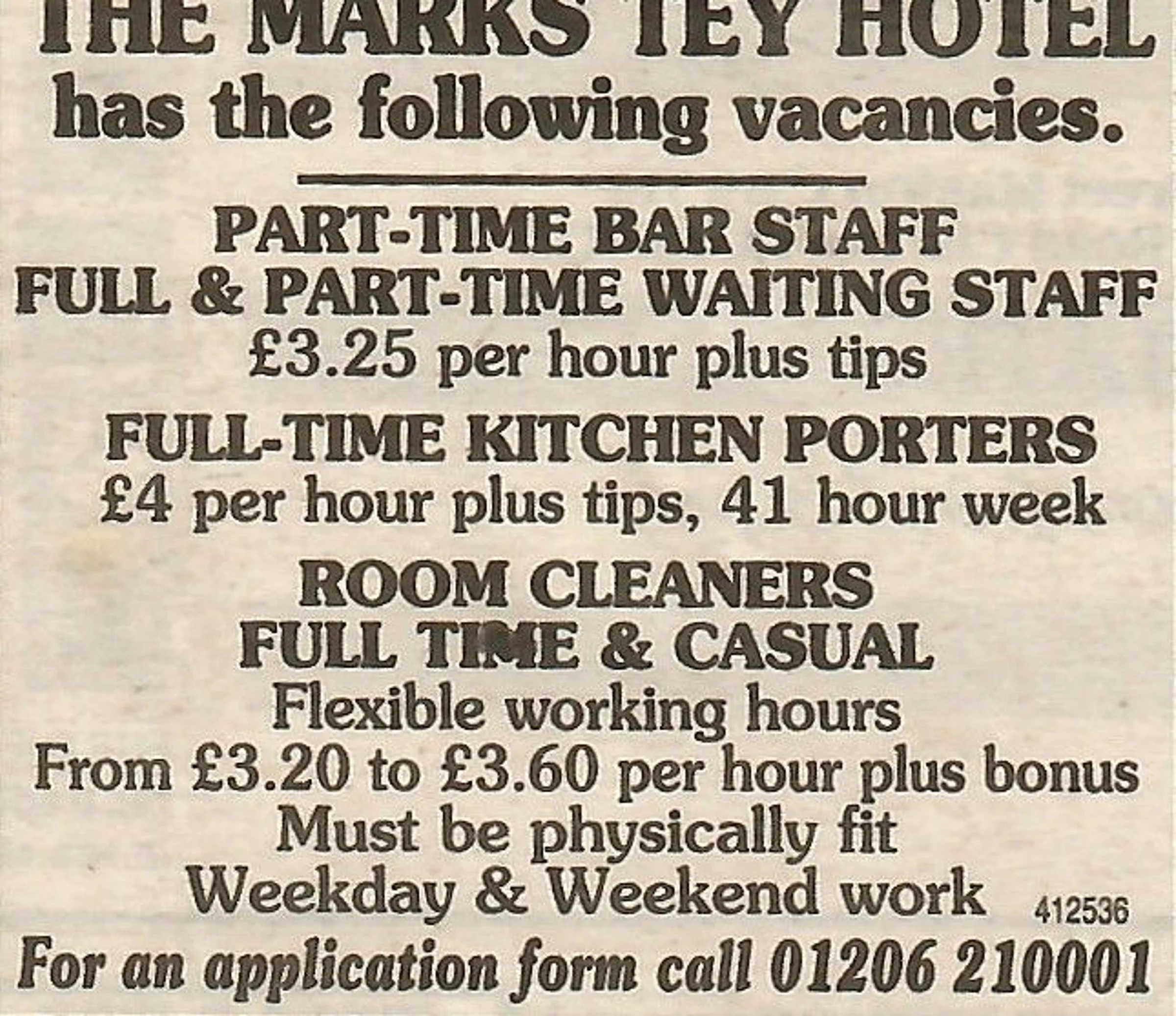 Newspaper job advertisement for the Marks Tey Hotel.