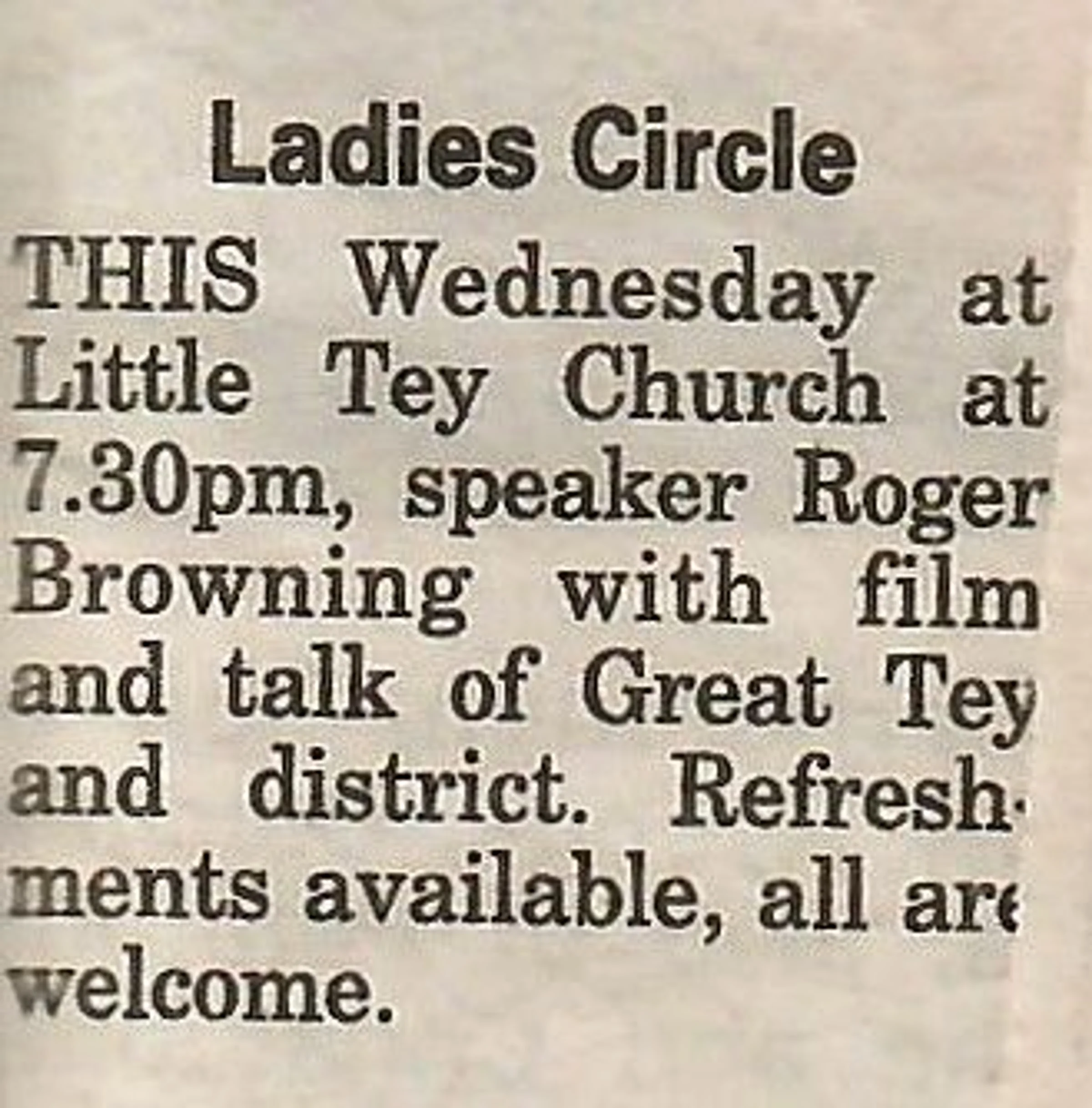 Village news column regarding the meeting of Little Tey Ladies Circle.