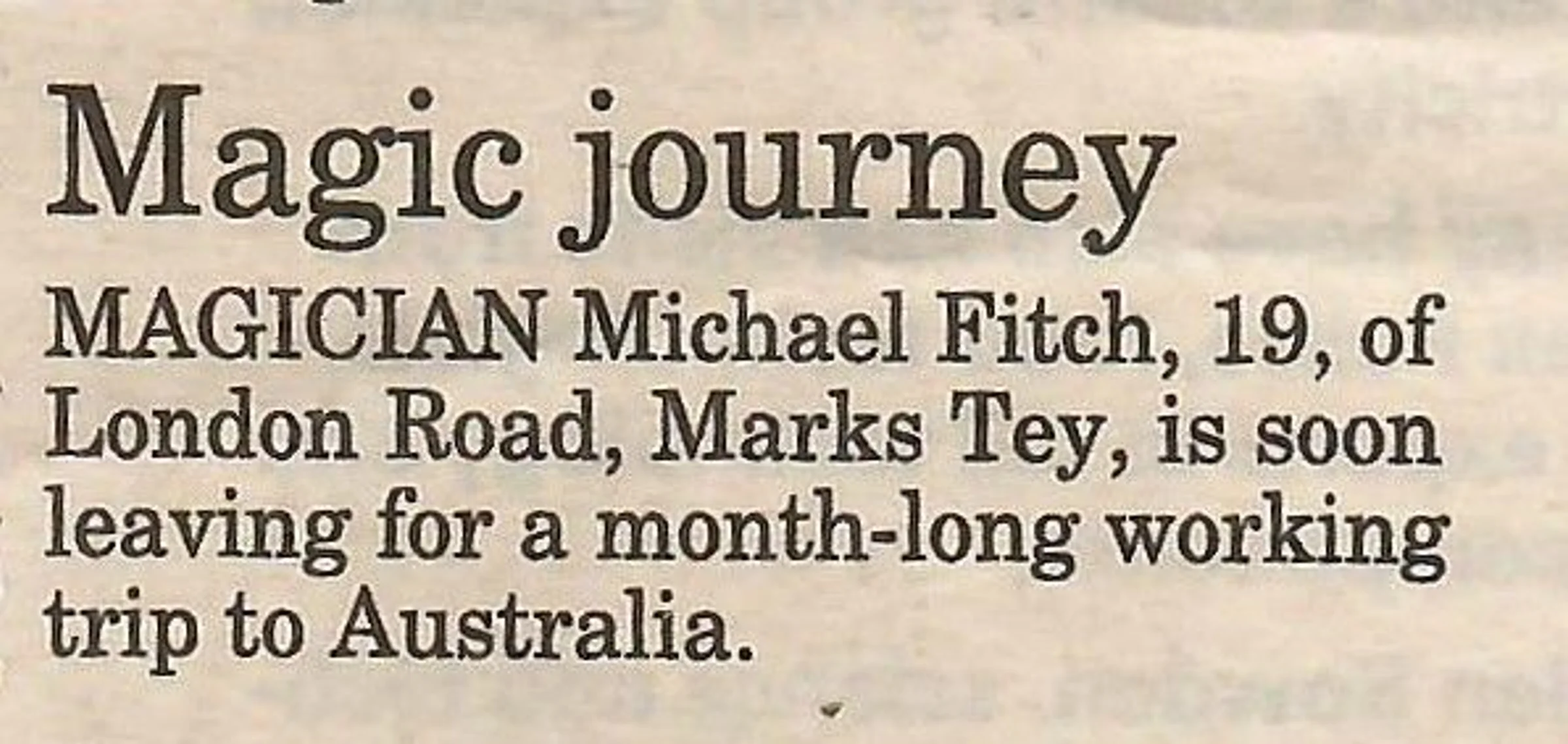 Newspaper report regarding a month-long trip to Australia by magician Michael Fitch.