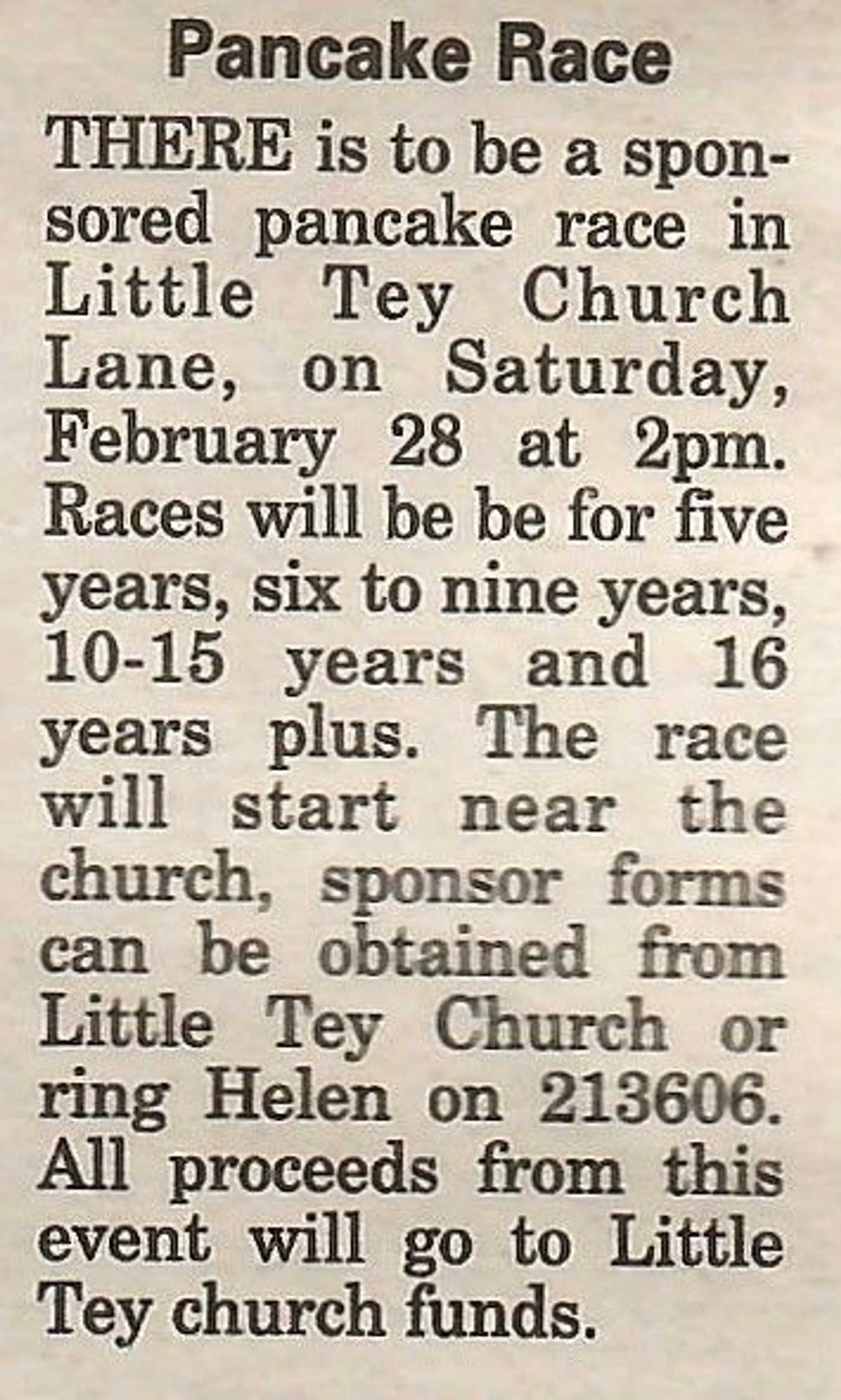 Village news column regarding the pancake race in Little Tey.