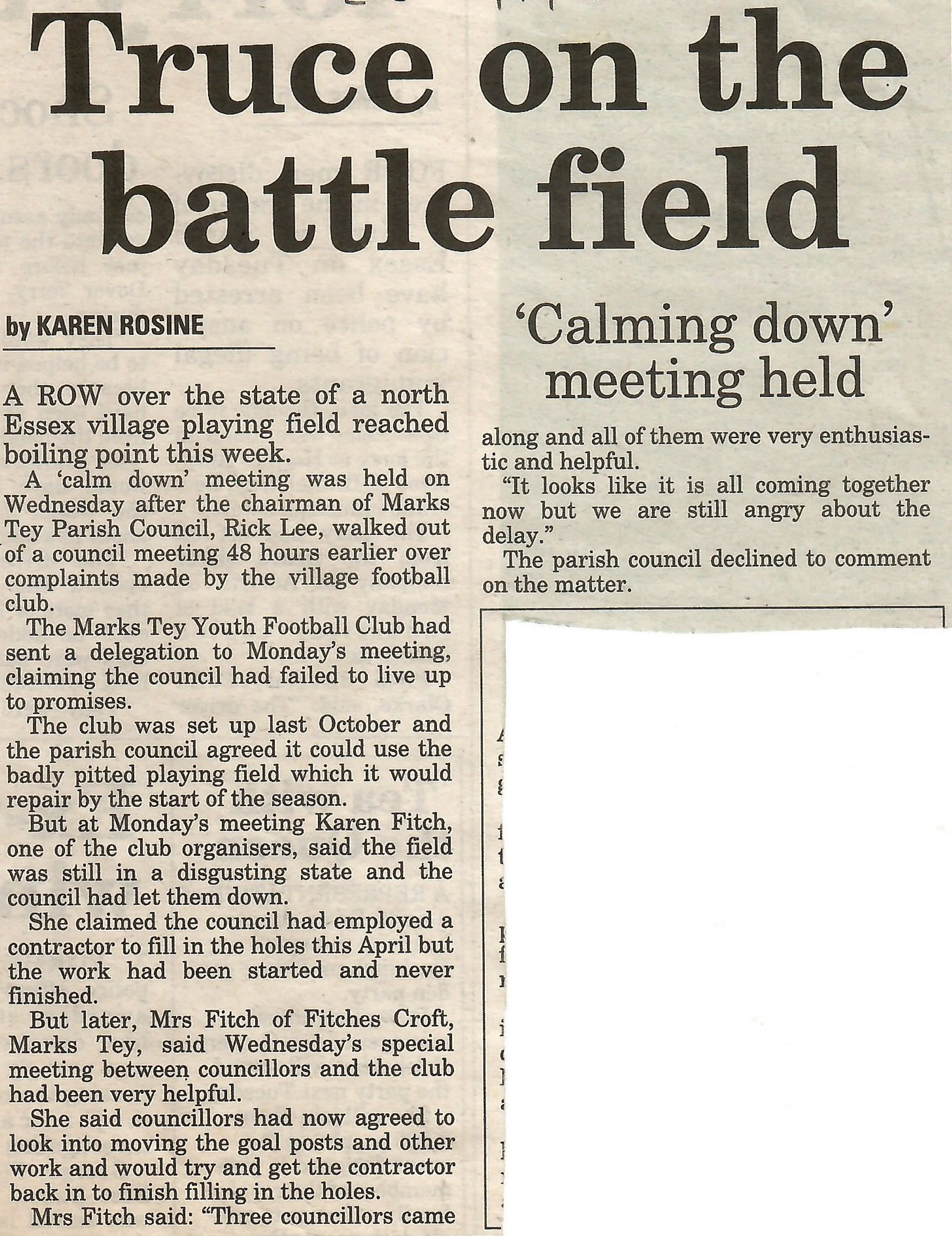 Newspaper article reporting on the conflict between the Parish Council and the Marks Tey Youth Football Club.