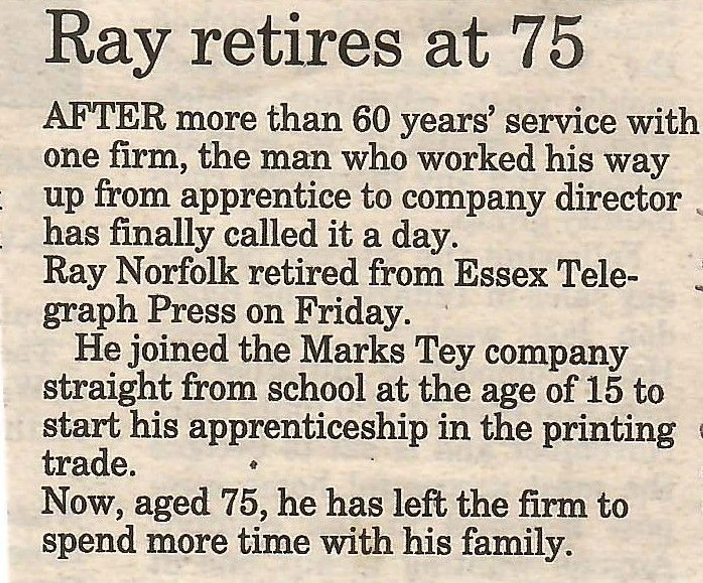 Newspaper report on the retirement of Ray Norfolk from Essex Telegraph Press.