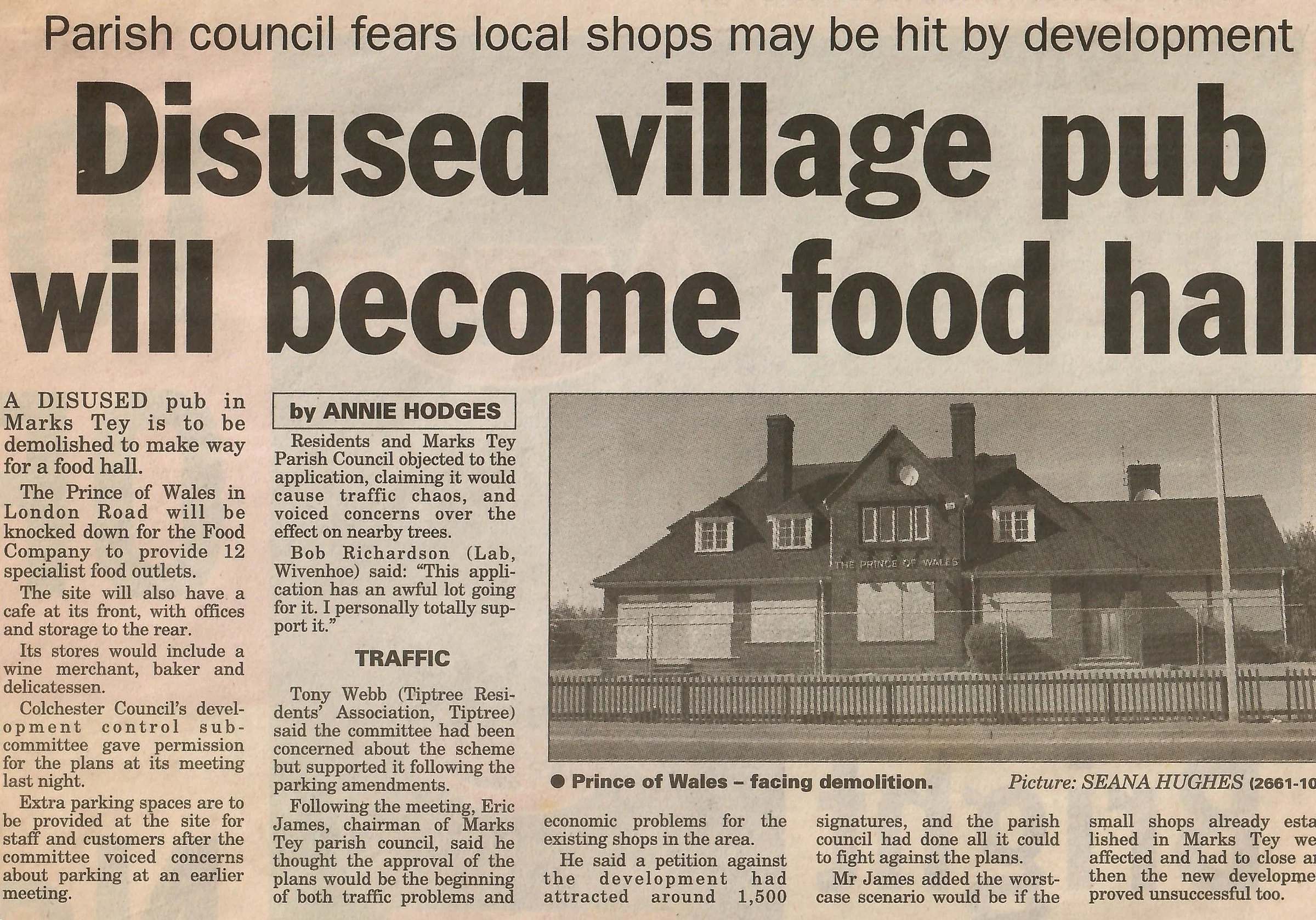 Newspaper photograph and report on plans to demolish the former Prince of Wales public house and build a food hall.