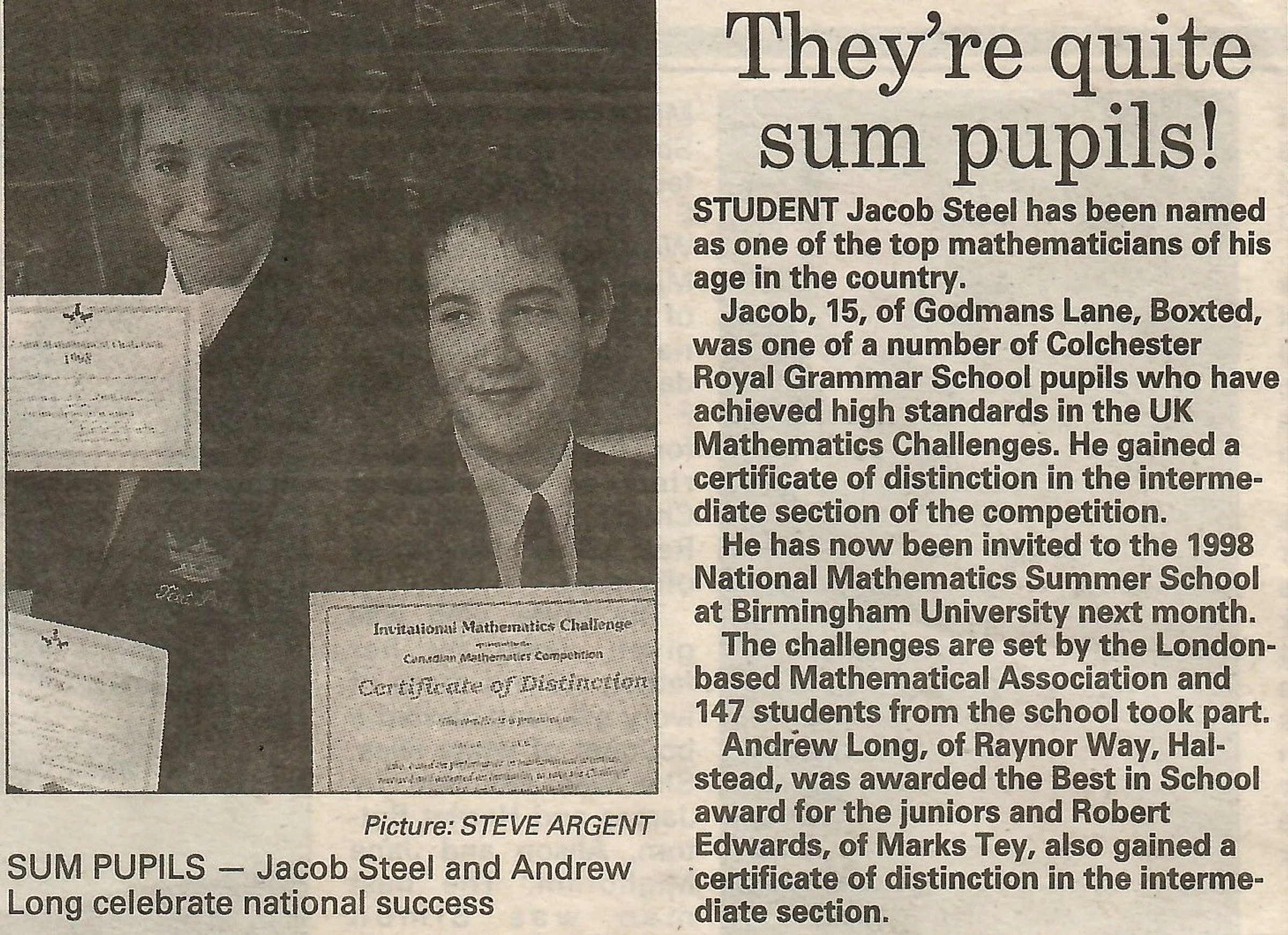 Newspaper photograph and report regarding on Mathematical Challenges and pupil Robert Edwards.