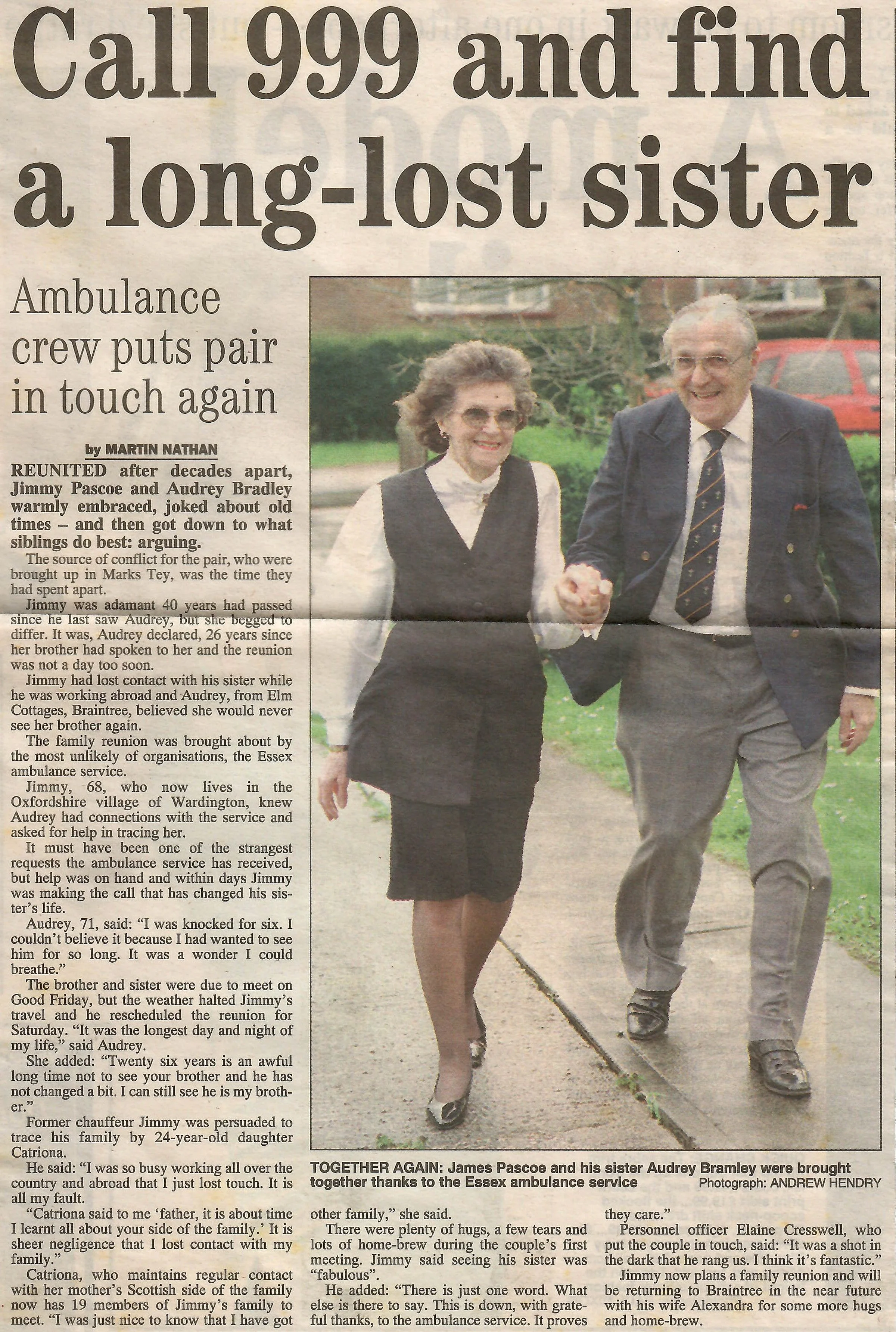 Newspaper photograph and report regarding reunited siblings Jimmy Pascoe and Audrey Bradley.