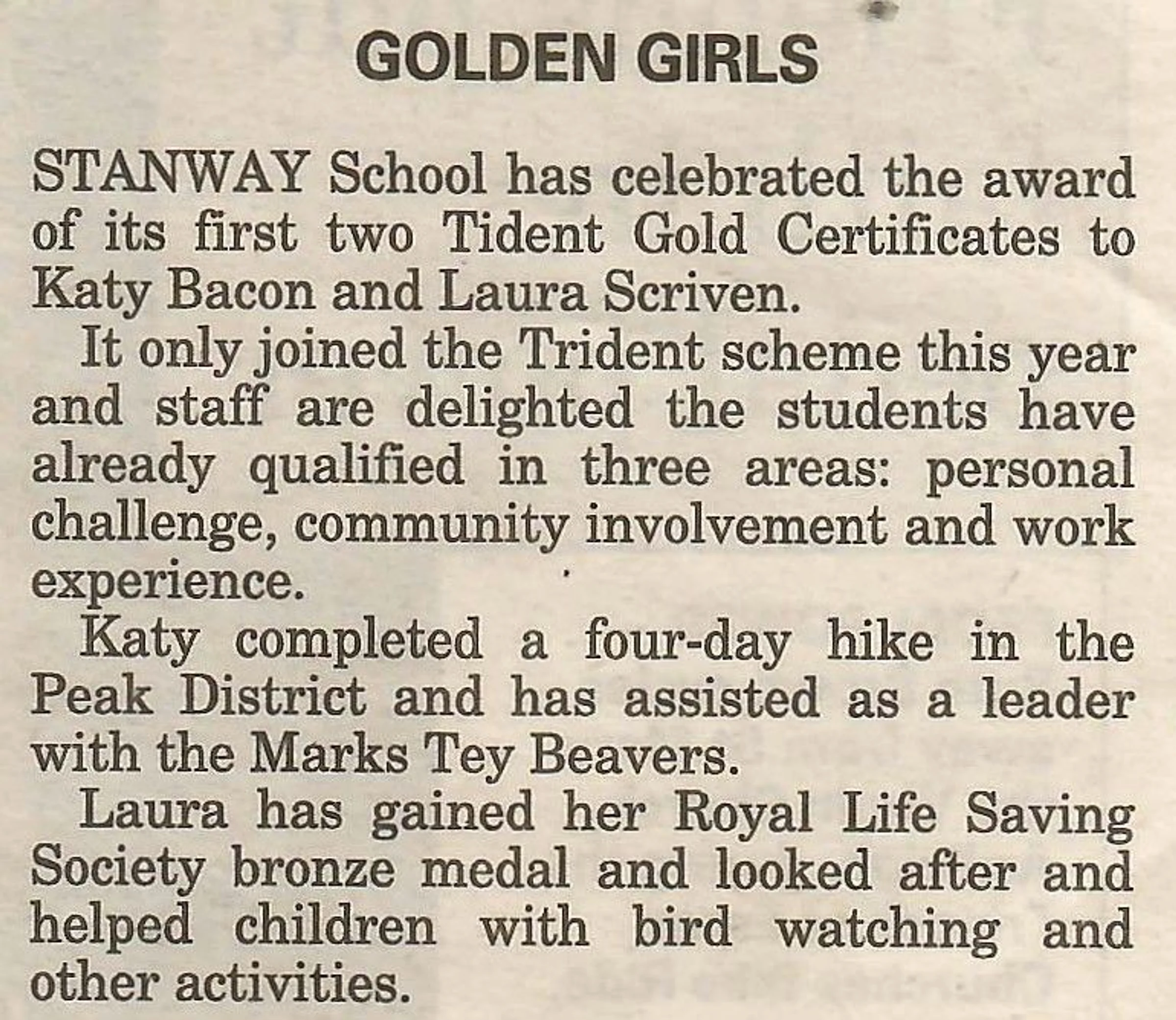 Newspaper report regarding Katy Bacon's Trident Gold Certificate after volunteering with the Marks Tey Beavers.