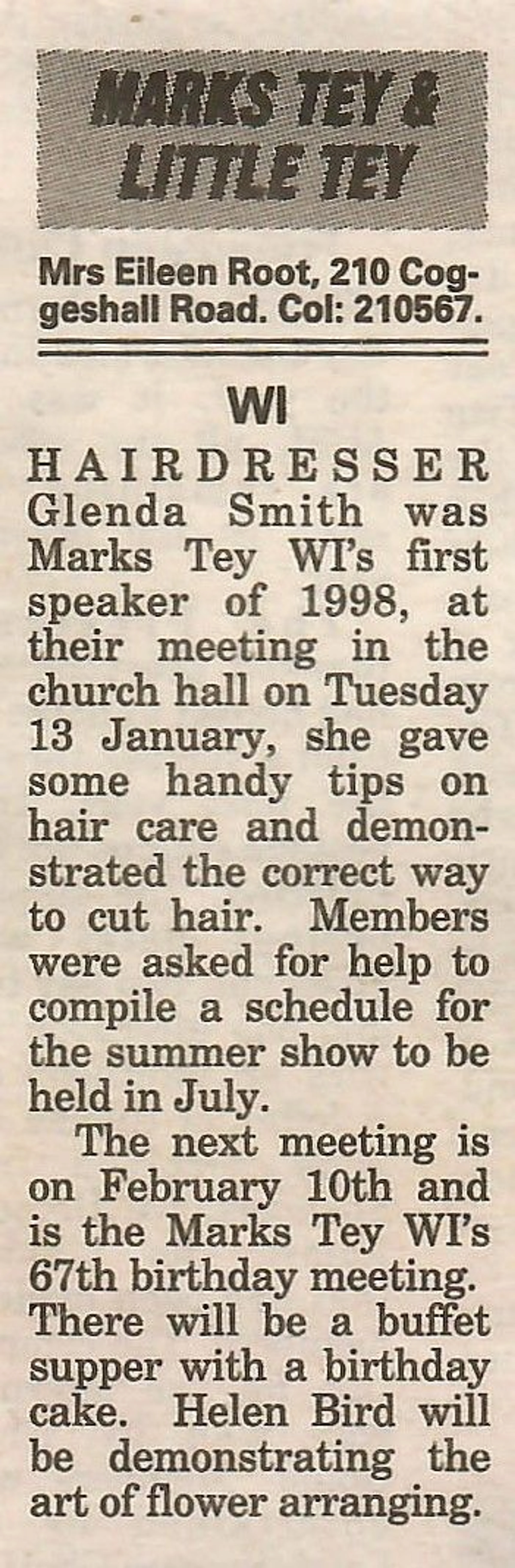 Local news column reporting on the January meeting of the Women's Institute.