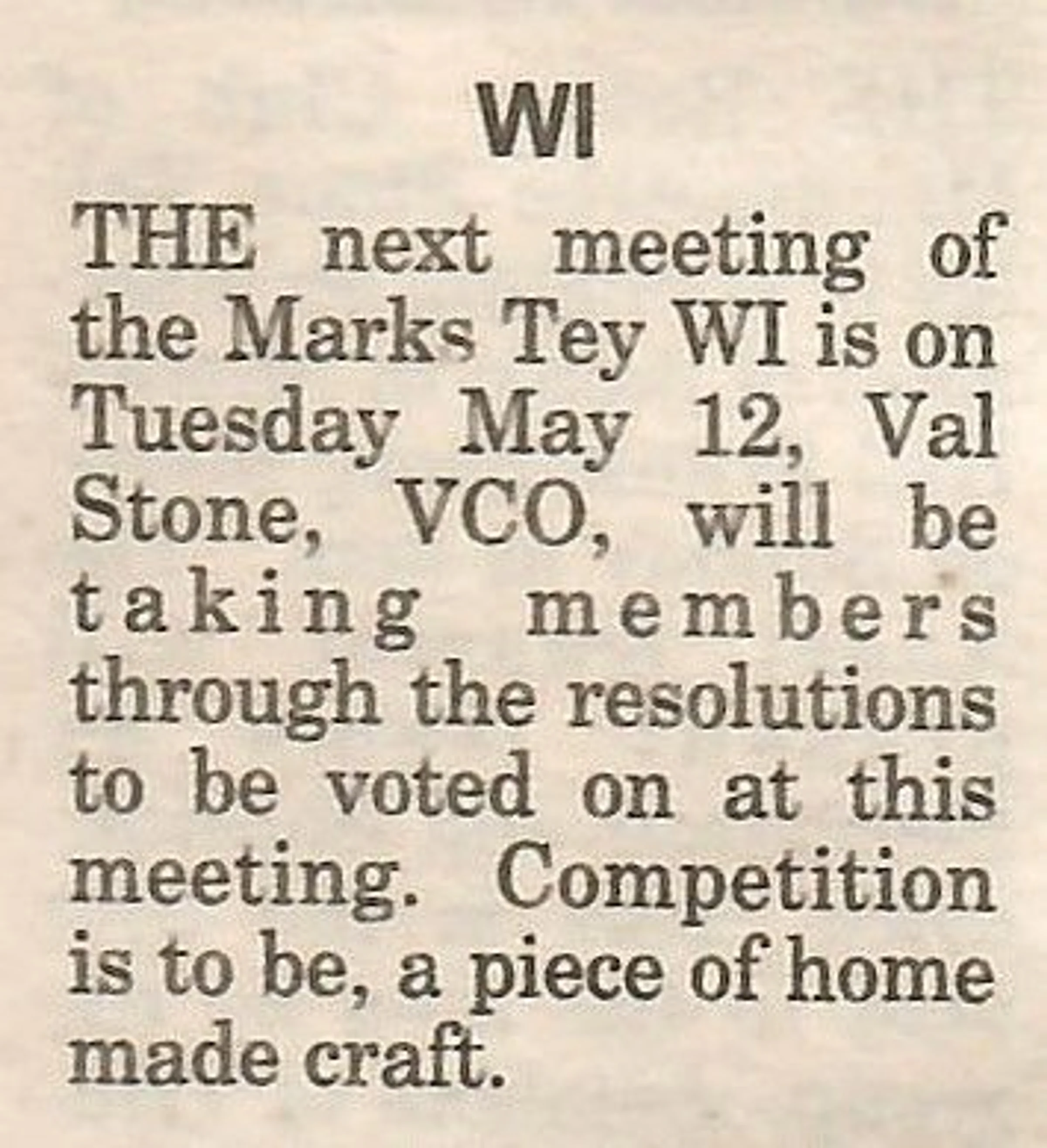 Local news column regarding the May meeting of the Women's Institute.
