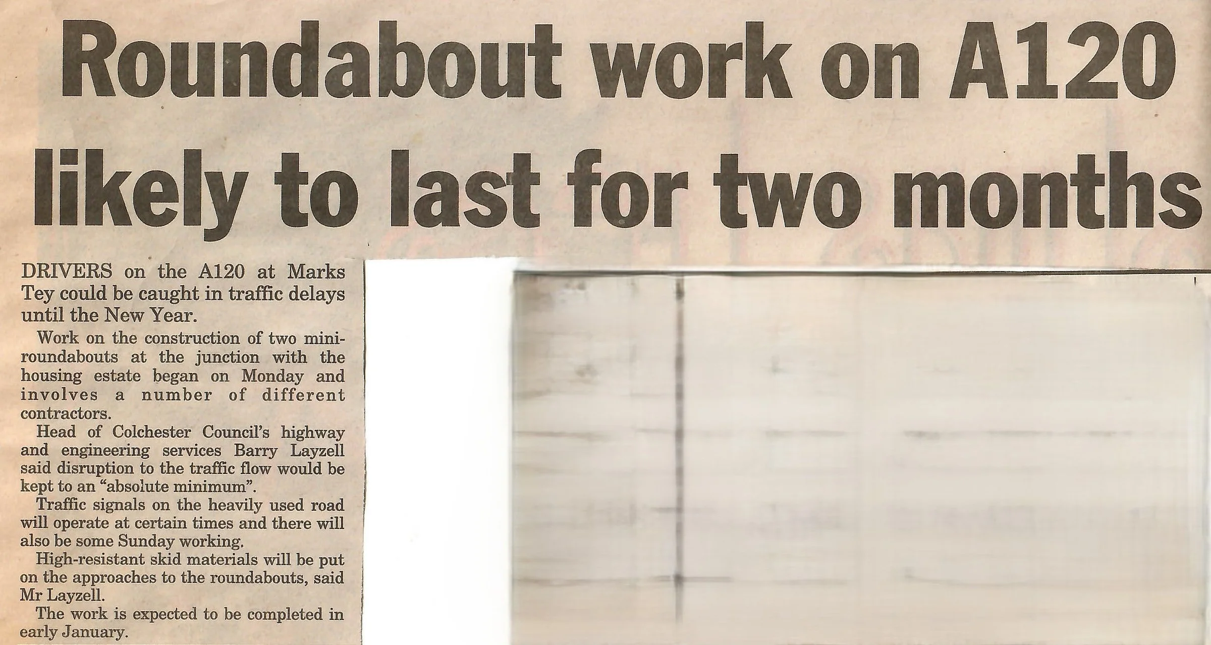 Newspaper report regarding construction of mini roundabouts on the A120.
