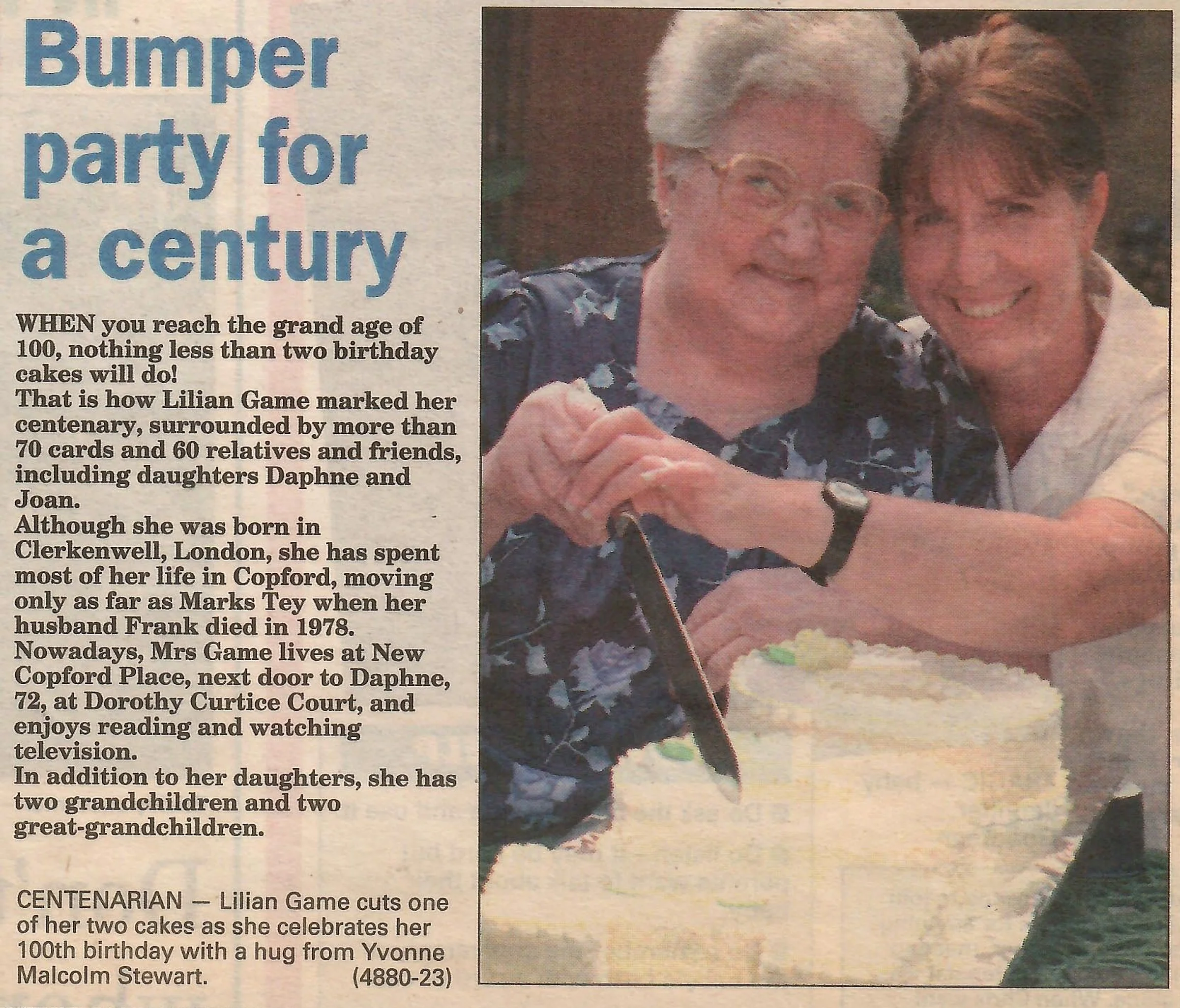 Newspaper photograph and report regarding the 100th birthday of Lilian Game.