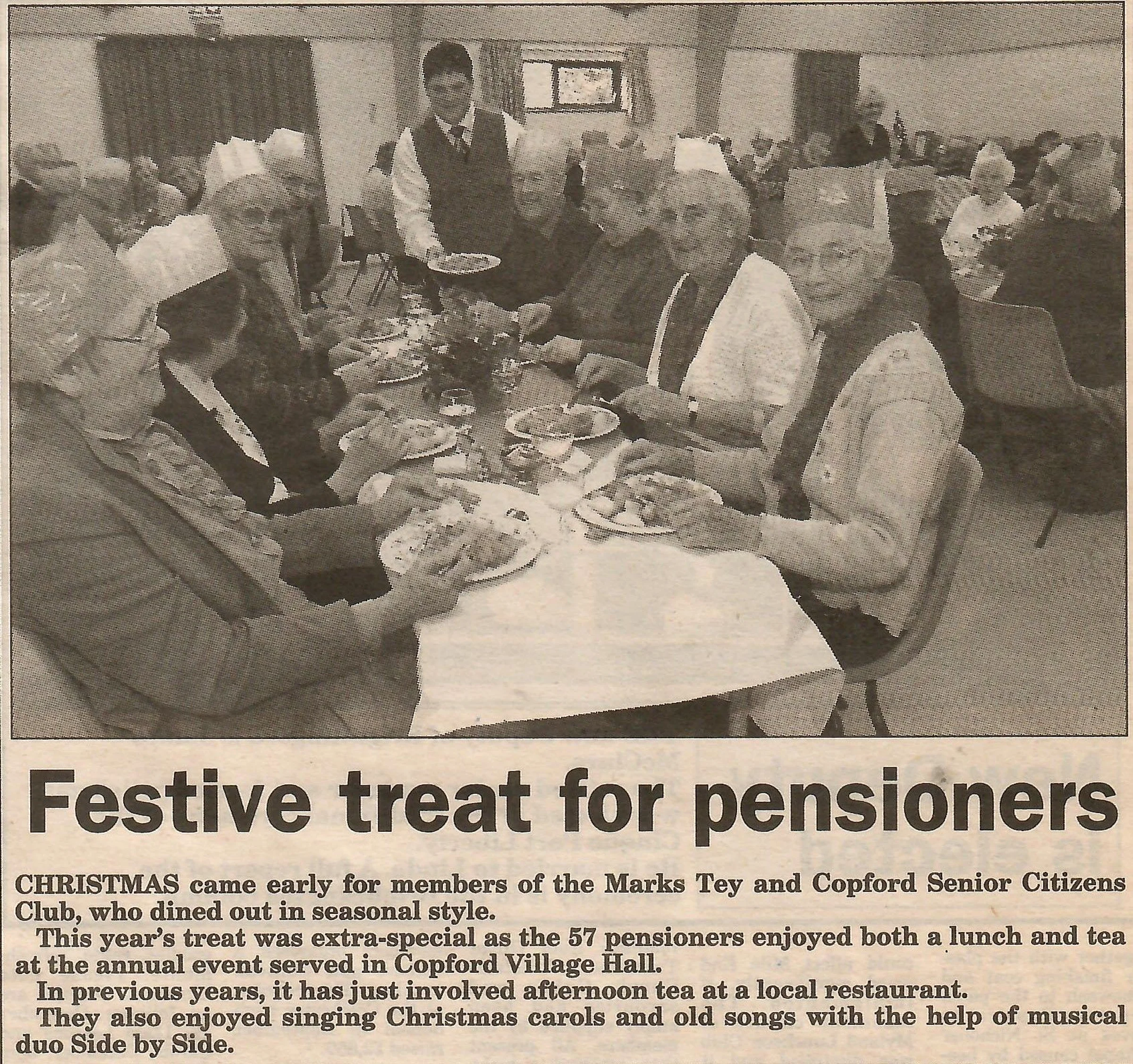 Newspaper article and photograph reporting on the Christmas dinner for the Marks Tey and Copford Senior Citizens Club.