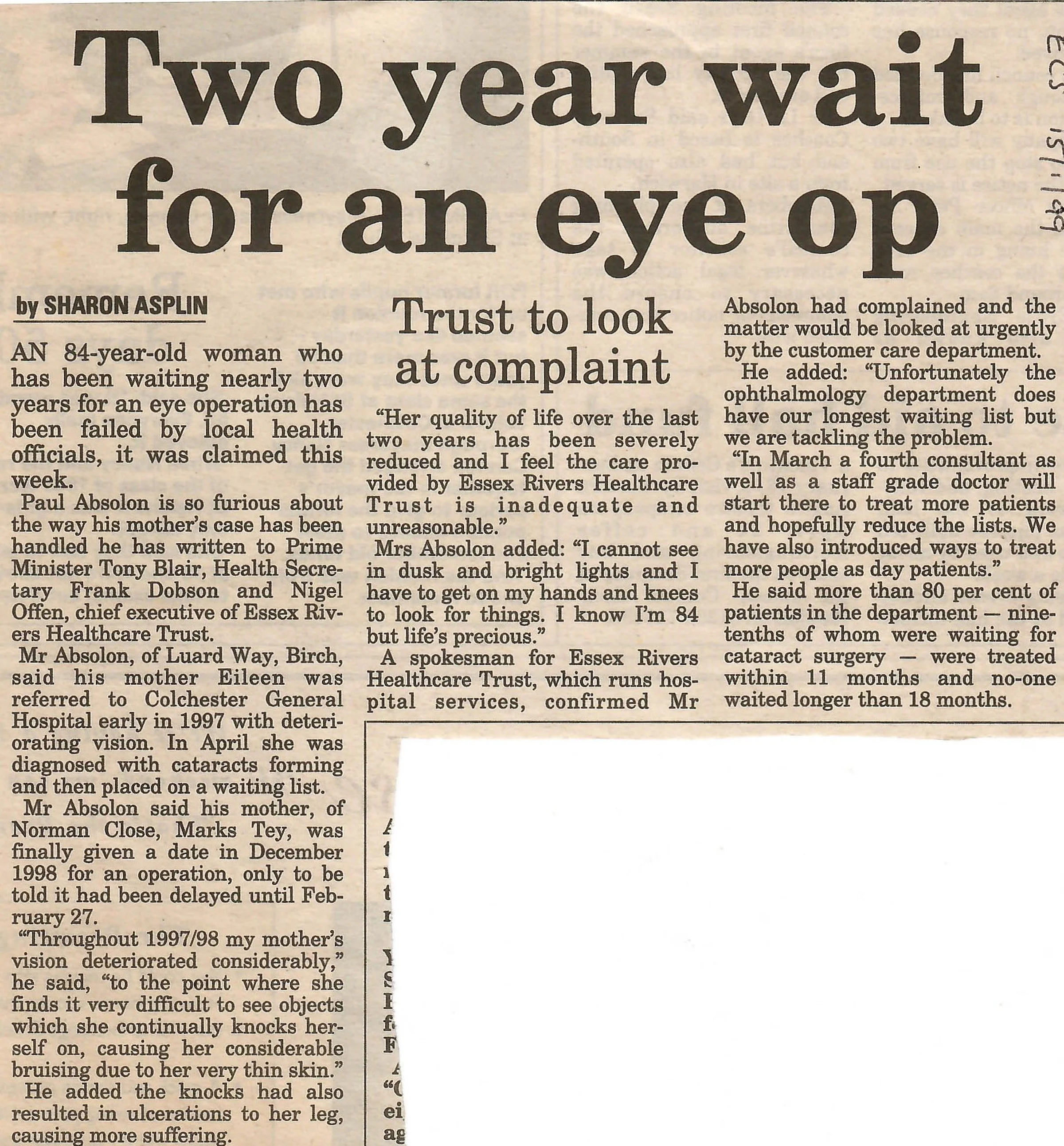 Newspaper report regarding the wait for Eileen Absolon's eye surgery.