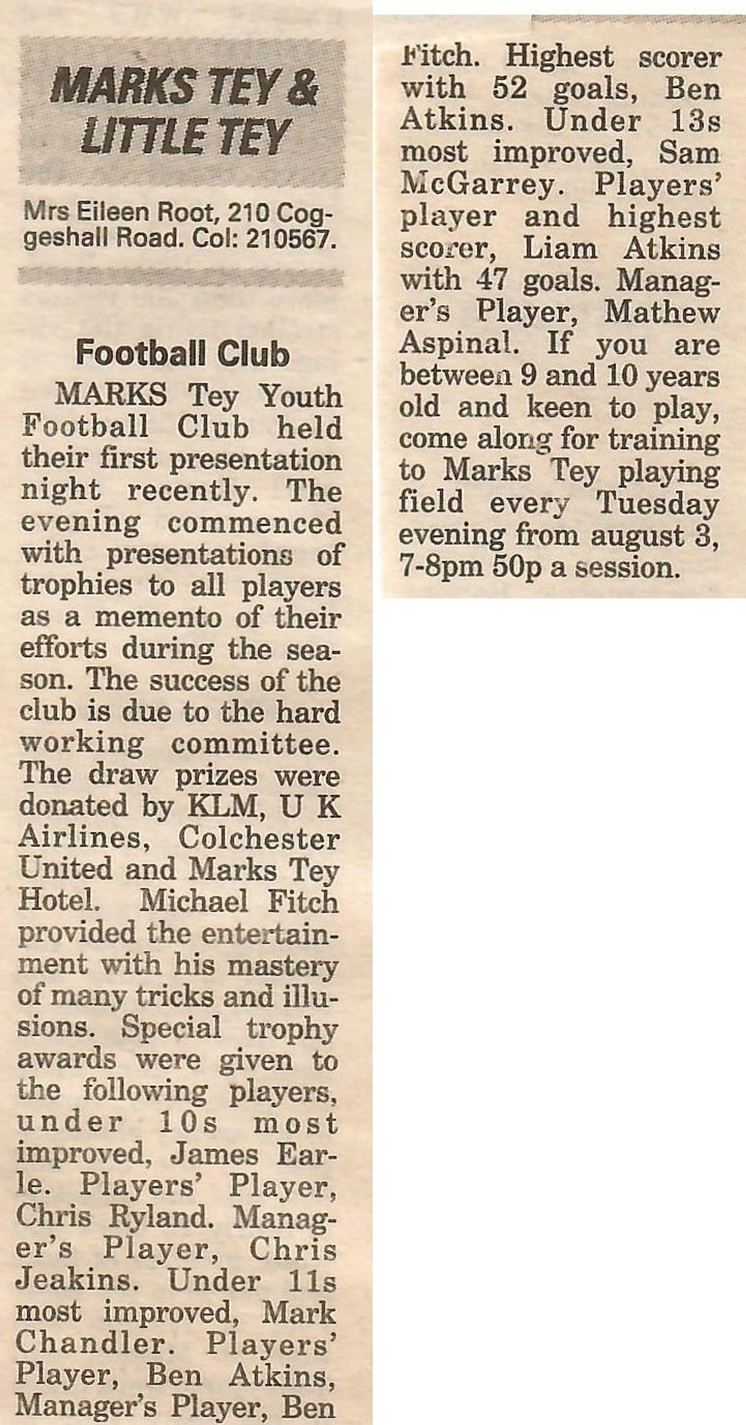 Village news column reporting on the presentation night of the Marks Tey Youth Football Club.