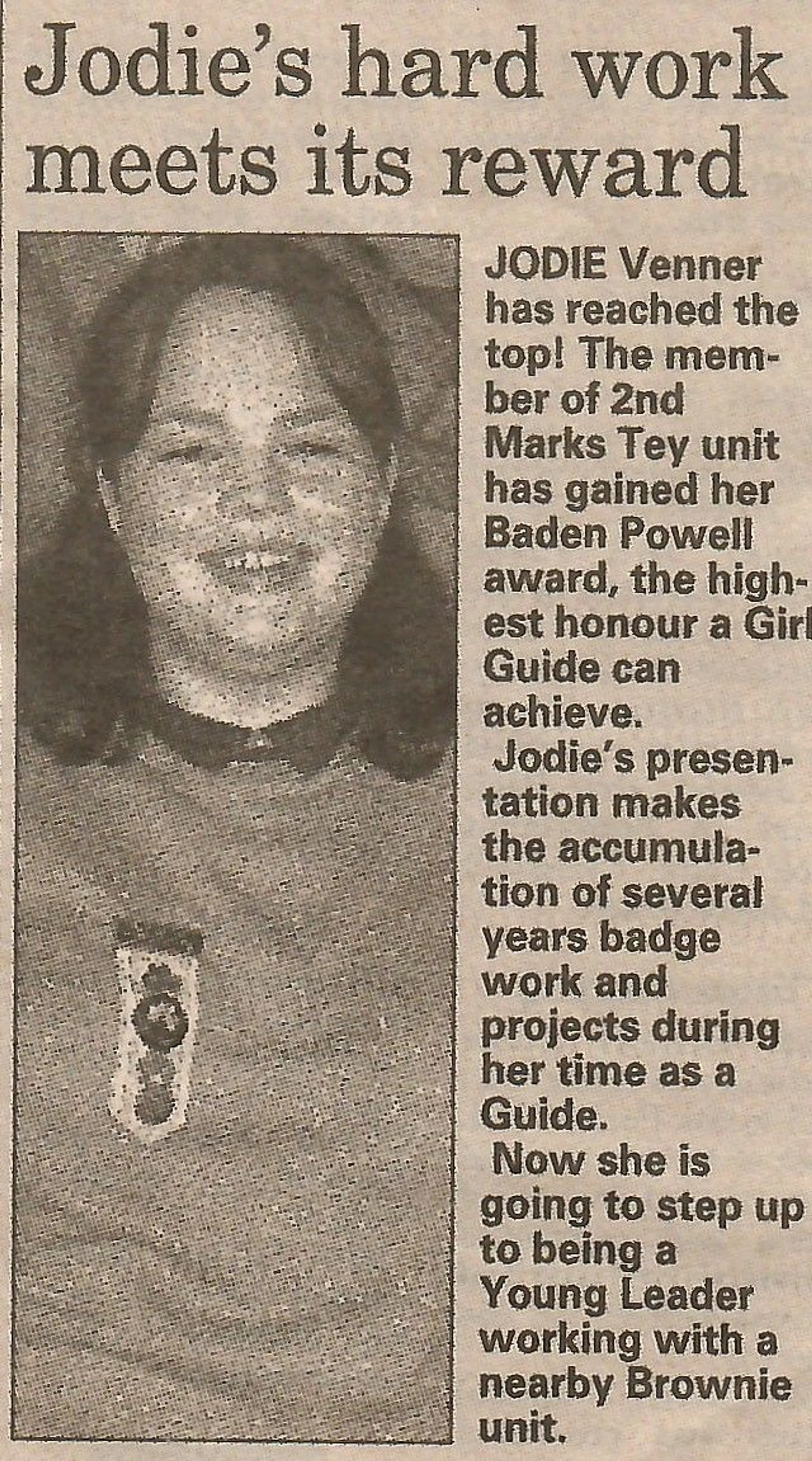 Article and photograph reporting on Jodie Venner achieving a Baiden Powell award.