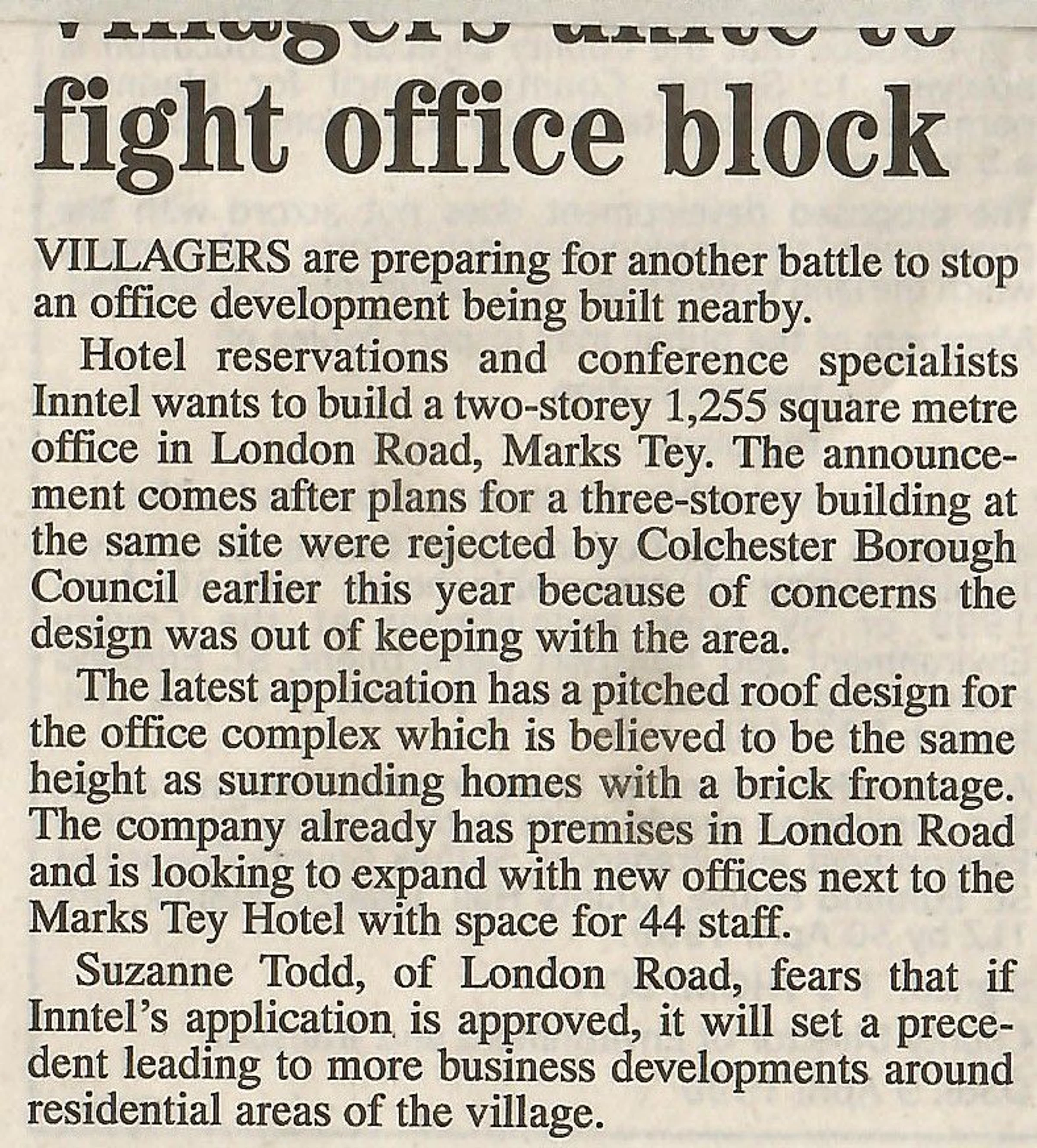 Newspaper report on a planning dispute regarding new offices for Inntel.