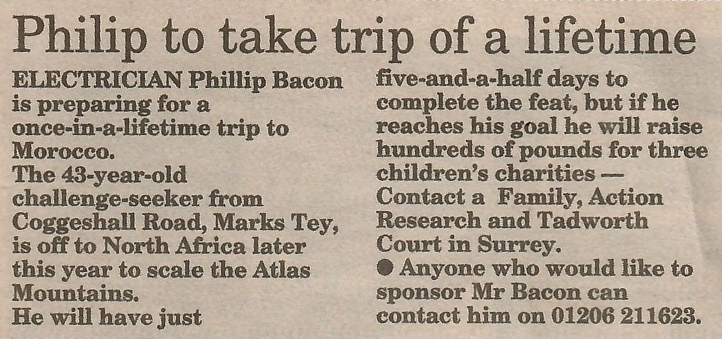 Newspaper report regarding a fundraising challenge in Morocco by Phillip Bacon.