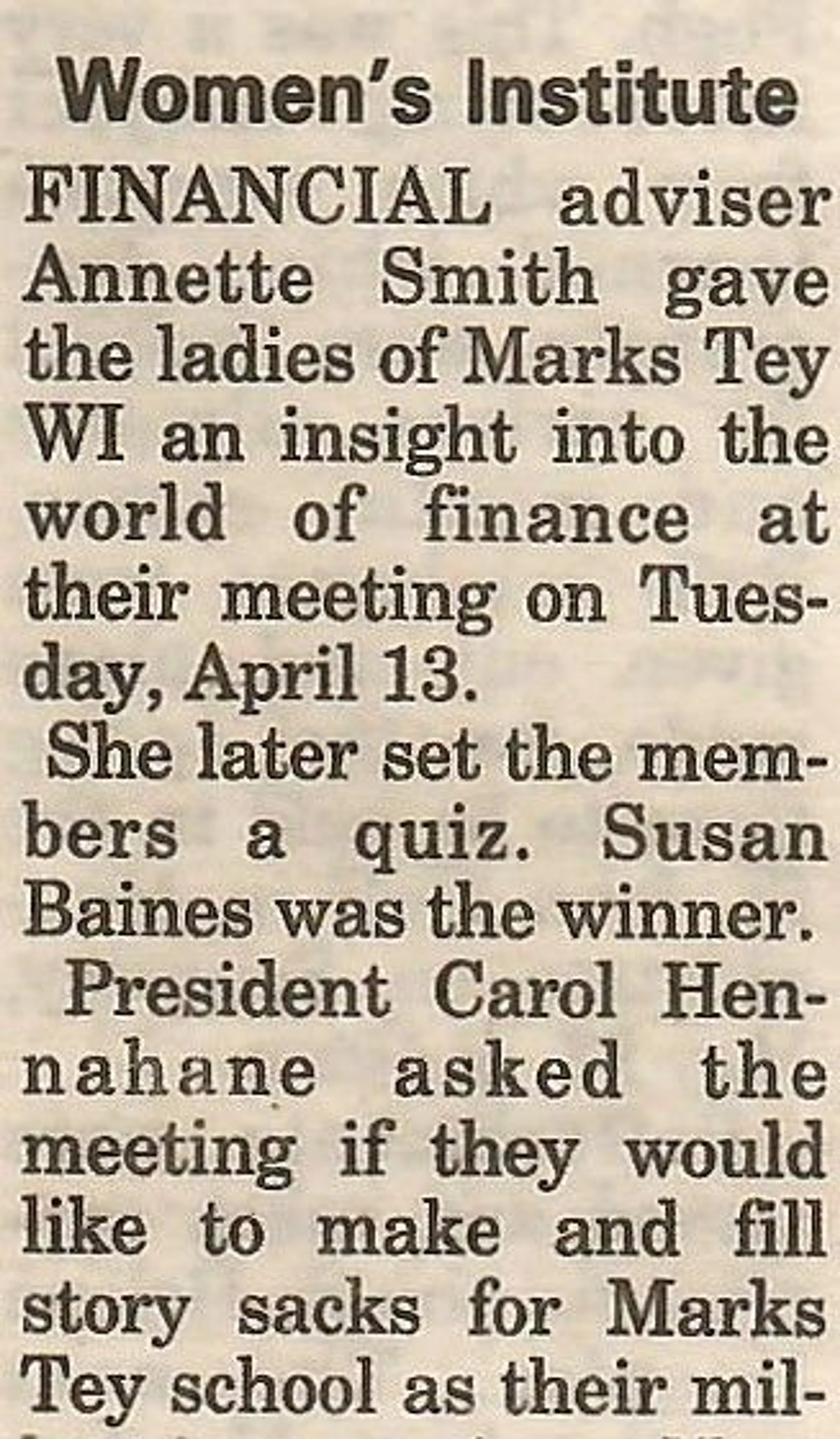 Local news column reporting on the April meeting of the Women's Institute.