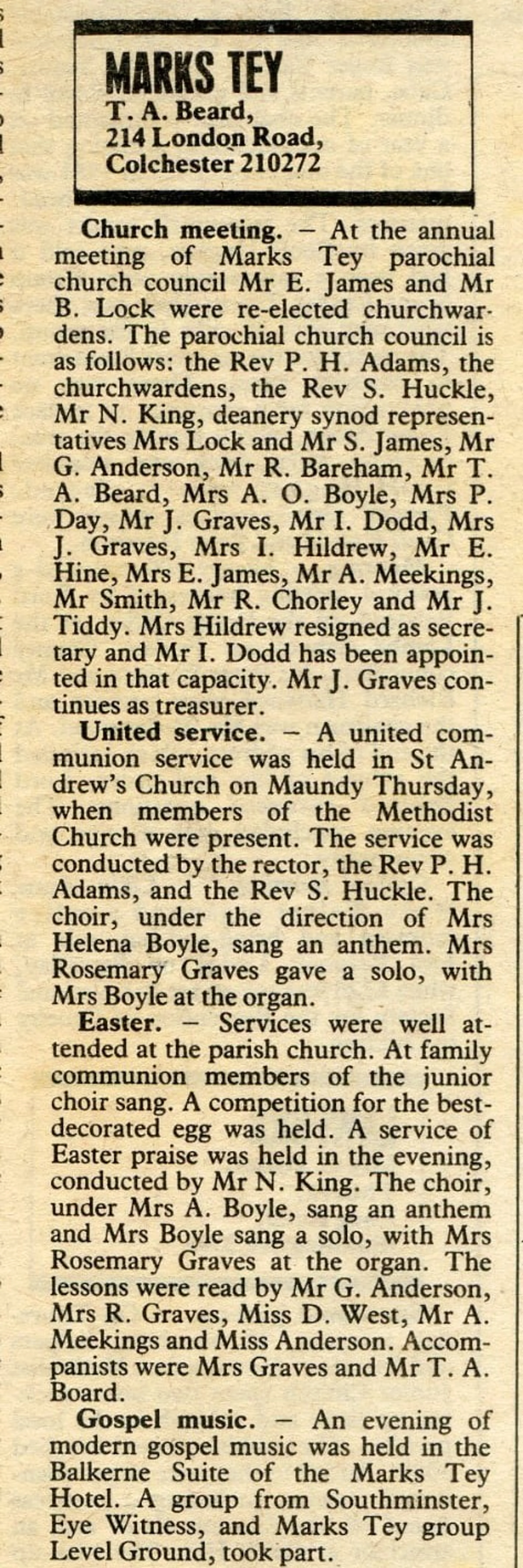 Village newspaper column reporting on St Andrew’s church news following Easter.
