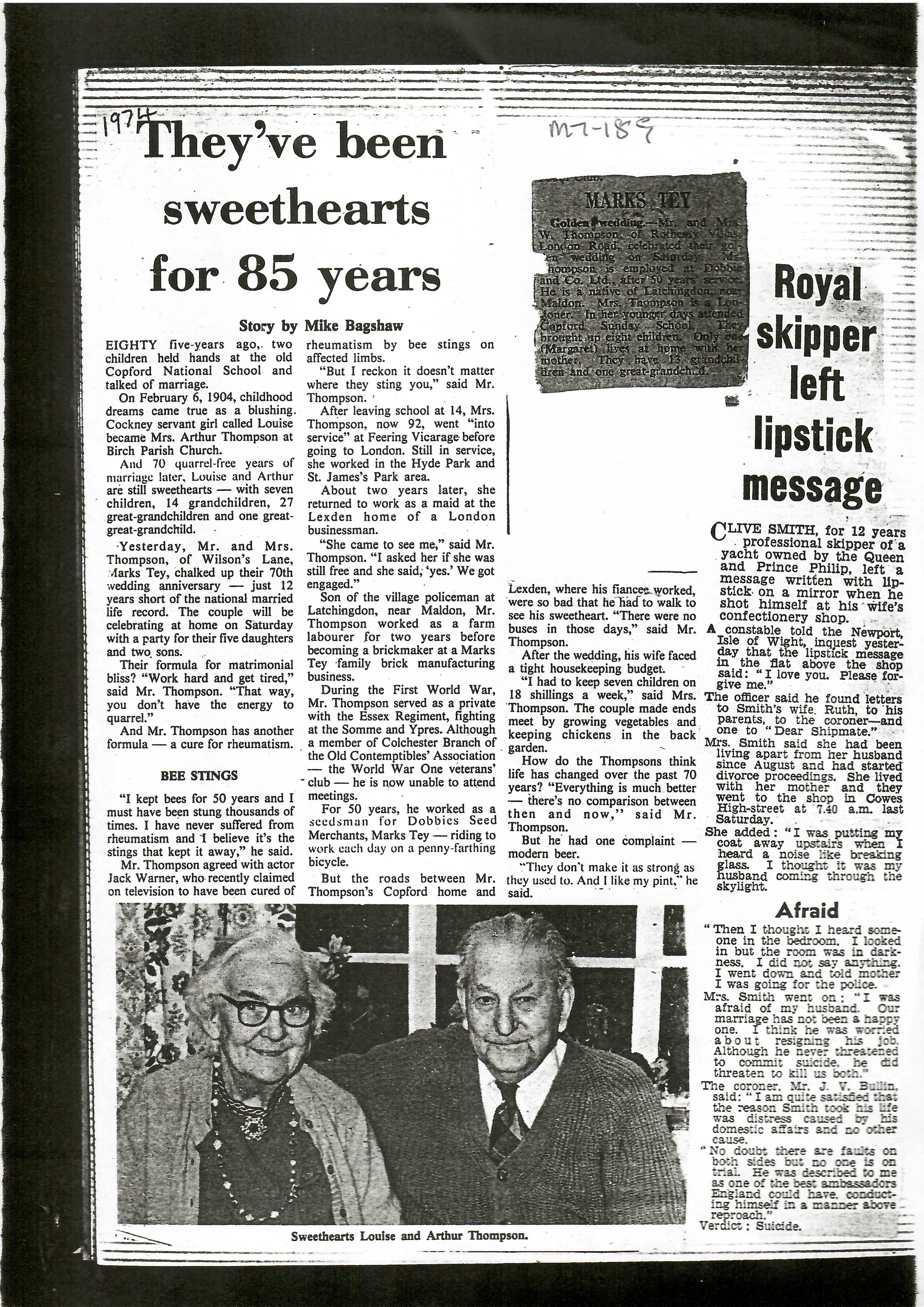 Eighty five-years ago, two children held hands at the old Copford National School and talked of marriage. On February 6, 1904, childhood dreams came true as a blushing, Cockney servant girl called Louise became Mrs Arthur Thompson at Birch Parish Church. And 70 quarrel-free years of marriage later, Louise and Arthur are still sweethearts - with 7 children, 14 grandchildren and 27 great-grandchildren and one great-great-grandchild. Yesterday, Mr. and Mrs. Thompson, of Wilson's Lane, Marks Tey, chalked up their 70th wedding anniversary - just 12 years short of the national married life record. The couple will be celebrating at home on Saturday with a party for their five daughters and two sons. Their formula for matrimonial bliss? "Work hard and get tired" said Mr. Thompson "That way you don't have the energy to quarrel." And Mr. Thompson has another formula - a cure for rheumatism. 'Bee Stings' "I.ve kept bees for 50 years and I must have been stung a thousand times. I have never suffered from rhuematism and I believe it's the stings that kept it away," he said. Mr. Thompson agreed with actor Jack Warner, who recently claimed on television to have been cured of rhuematism by bee stings on affected limbs. "But I reckon it doesn't matter where they sting you," said Mr. Thompson. After leaving school at 14, Mrs. Thompson, now 92, went "into service" at Feering Vicarage before going to London. Still in service she worked in the Hyde Park area and st James Park area. About two years later, she returned home to work as a maid at the Lexden home of a London businessman. "She came to see me," said Mr Thompson/ "I asked her if she was still free and she said 'yes.' and we got engaged." Son of the village policeman at Latchingdon, near Maldon, Mr. Thompson worked as a farm labourer for two years before becoming a brickmaker at a Marks Tey family brick manufacturing business. During the First World War, Mr. Thompson served as a private with the Essex Regiment, fighting at the Somme and Ypres. Although a member of Colchester Branch of the Old Contemptibles' Association - the World War One veterans' club - he is now unable to attend meetings. For 50 years, we worked as a seedsman for Dobbies Seed Merchants, Marks Tey - riding to work each day on a penny-farthing bicycle. But the roads between Mr. Thompson's Copford home and Lexden, where his fiance worked, were so bad that he had to walk to see his sweetheart. "There were no buses in those days," said Mr. Thompson. After the wedding, his wife faced a tight housekeeping budget. "I had to keep seven children on 18 shillings a week," said Mrs. Thompson. The couple made ends meet by growing vegetables and keeping chickens in the back garden. How do the Thompsons think life has changed over the last 70 years? "Everything is much better - there's no comparison between then and now," said Mr. Thompson. But he had one complaint - Modern beer. "They don't make it strong as they used to. And I like my pint," He said.