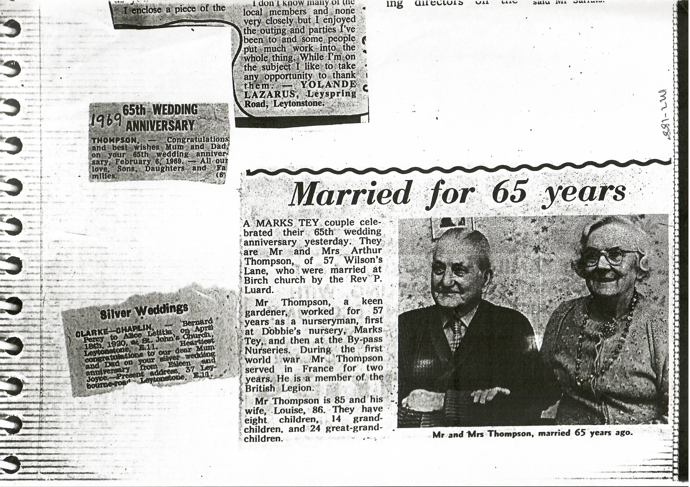 Newspaper clippings, on entitled '65th Wedding Anniversary', the other 'Married for 65 years' celebrating Louise and Arthur Thompson's 65th anniversary, recording Mr. Thompson's working history and their family. A photograph of the couple is attached, labelled 'Mr and Mrs Thompson, married 65 years ago'.