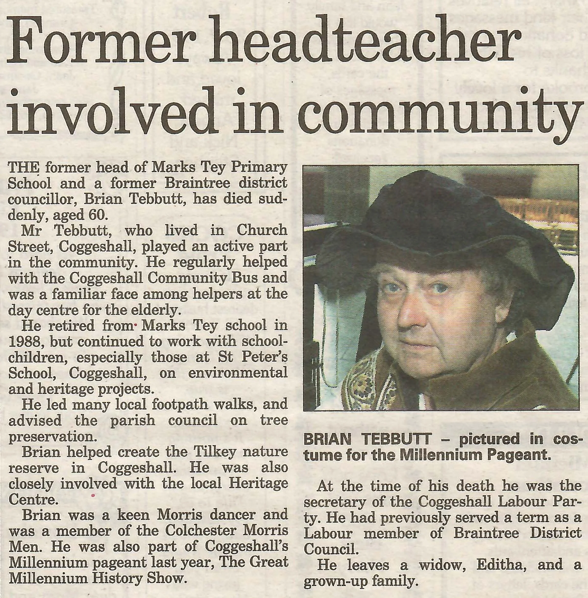 Newspaper obituary for Brian Tebbutt, former headteacher of St Andrew’s Primary.