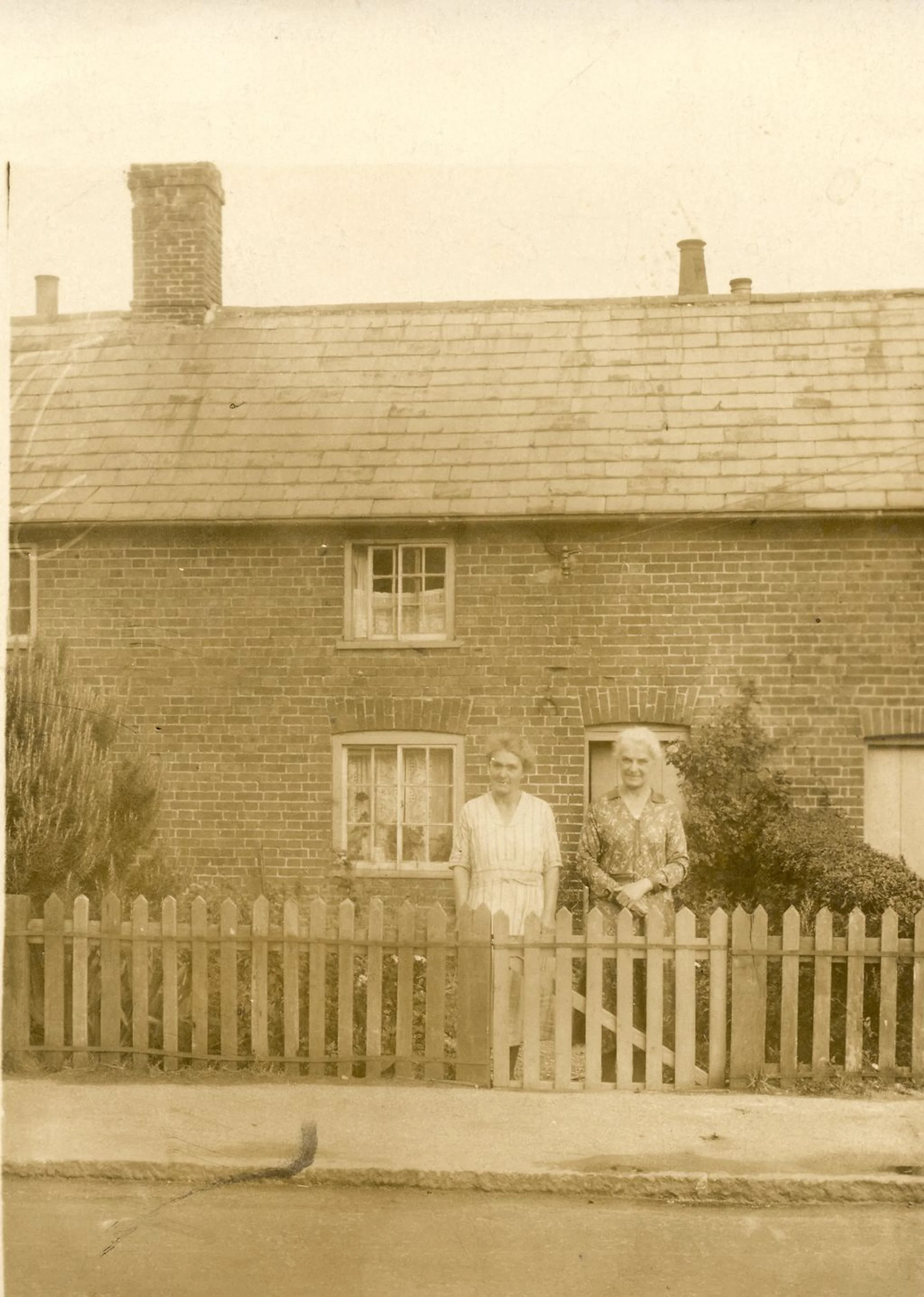 Cottages on London Road that have been demolished. There are two ladies standing at a gate.
