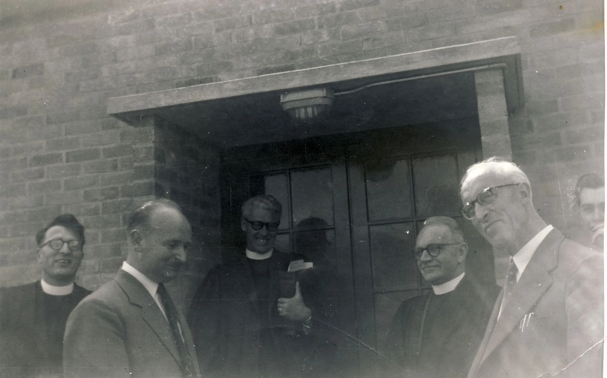 A few men, three with dog collars, outside the doors to the new Sunday School Hall which was opened on Saturday, 6th June 1959.
