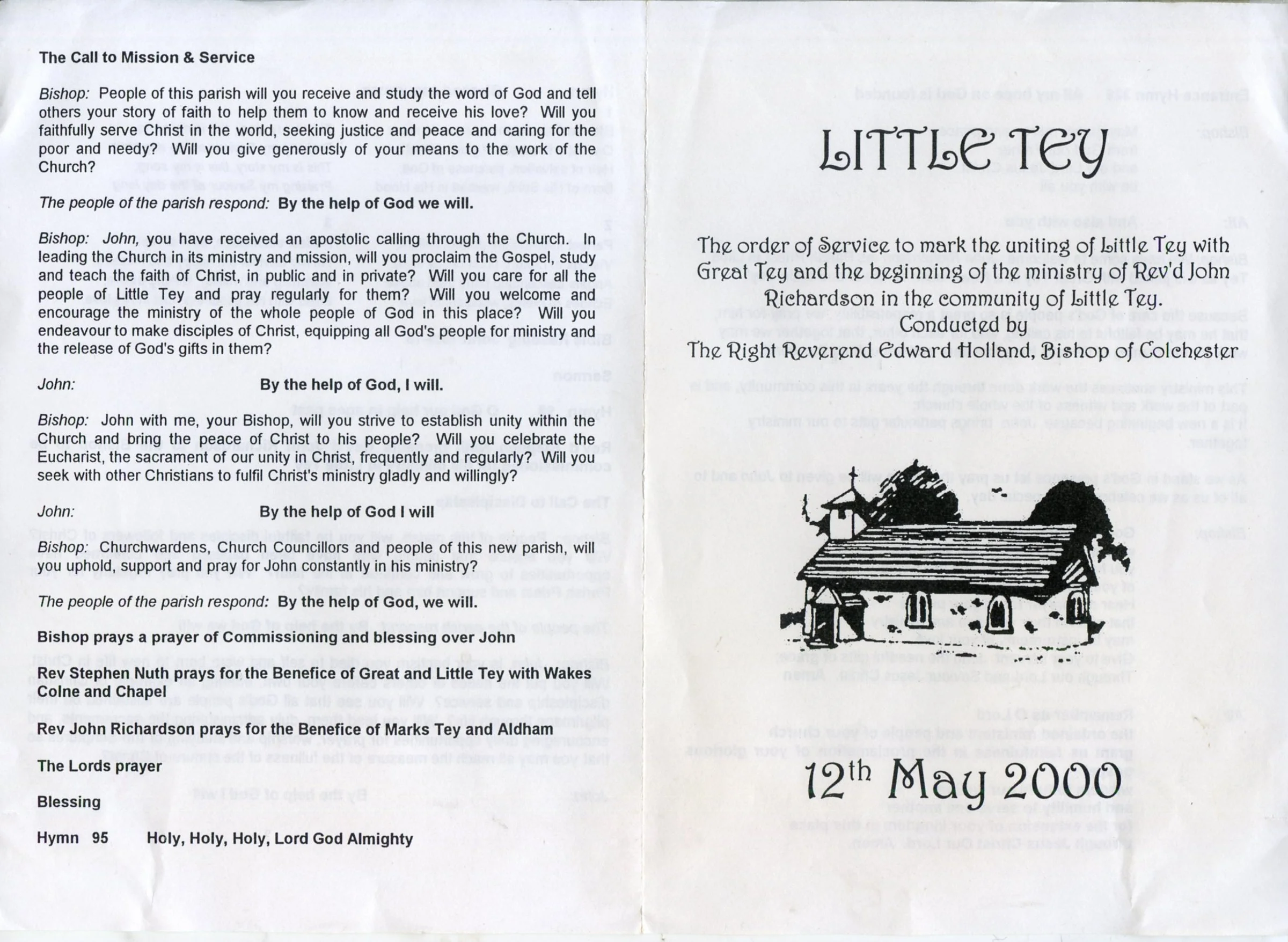 The order of Service to mark the uniting of Little Tey with Great Tey and the beginning of the ministry of Rev'd John Richardson in the community of Little Tey.