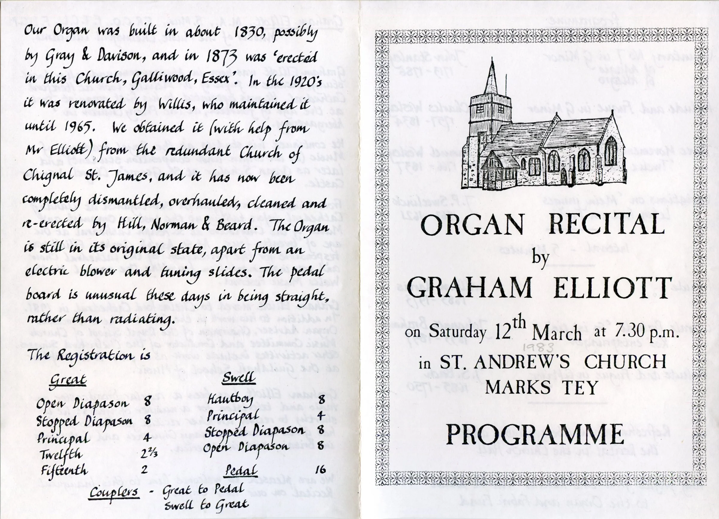 This concert on the newly-installed pipe organ at the back of St Andrew's church was given by Dr Graham Elliott, Organist of Chelmsford Cathedral.