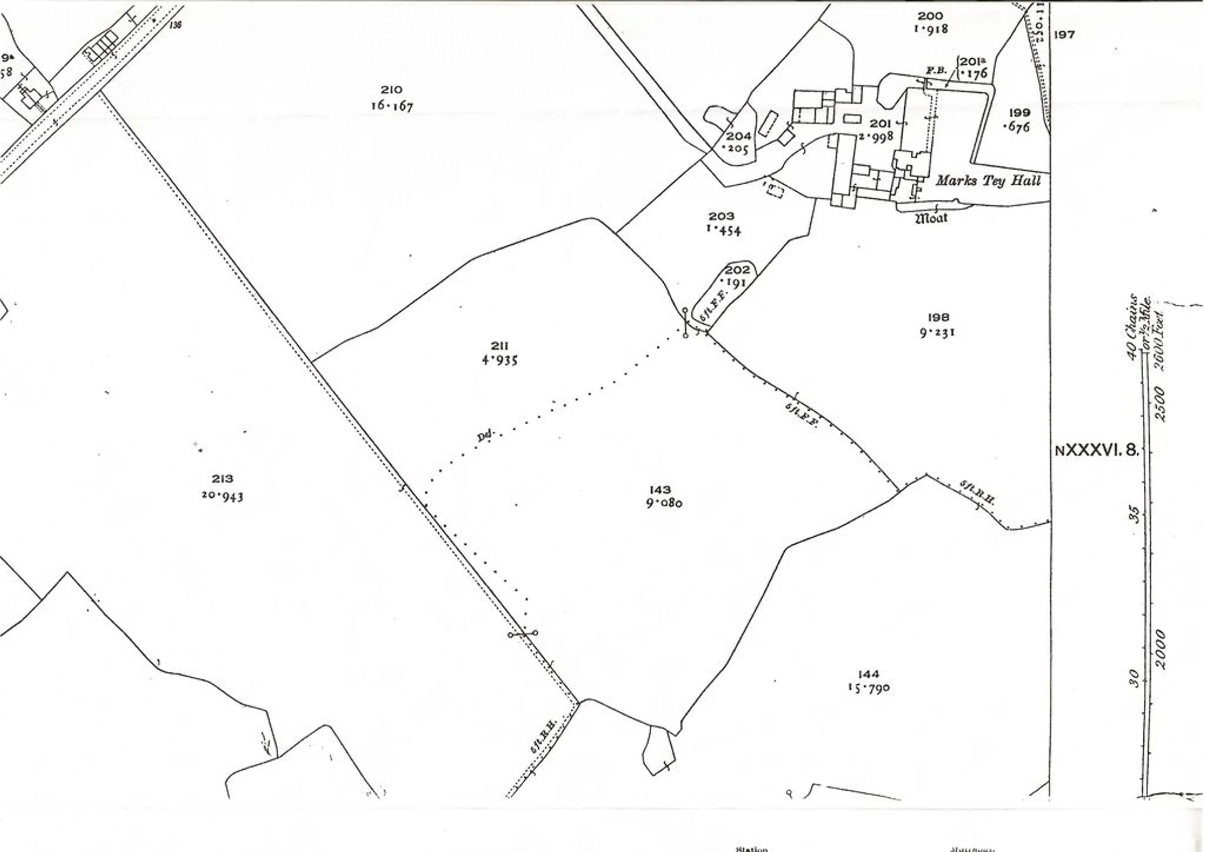The top right of the image shows the buildings, outbuildings and moat at Marks Tey Hall.