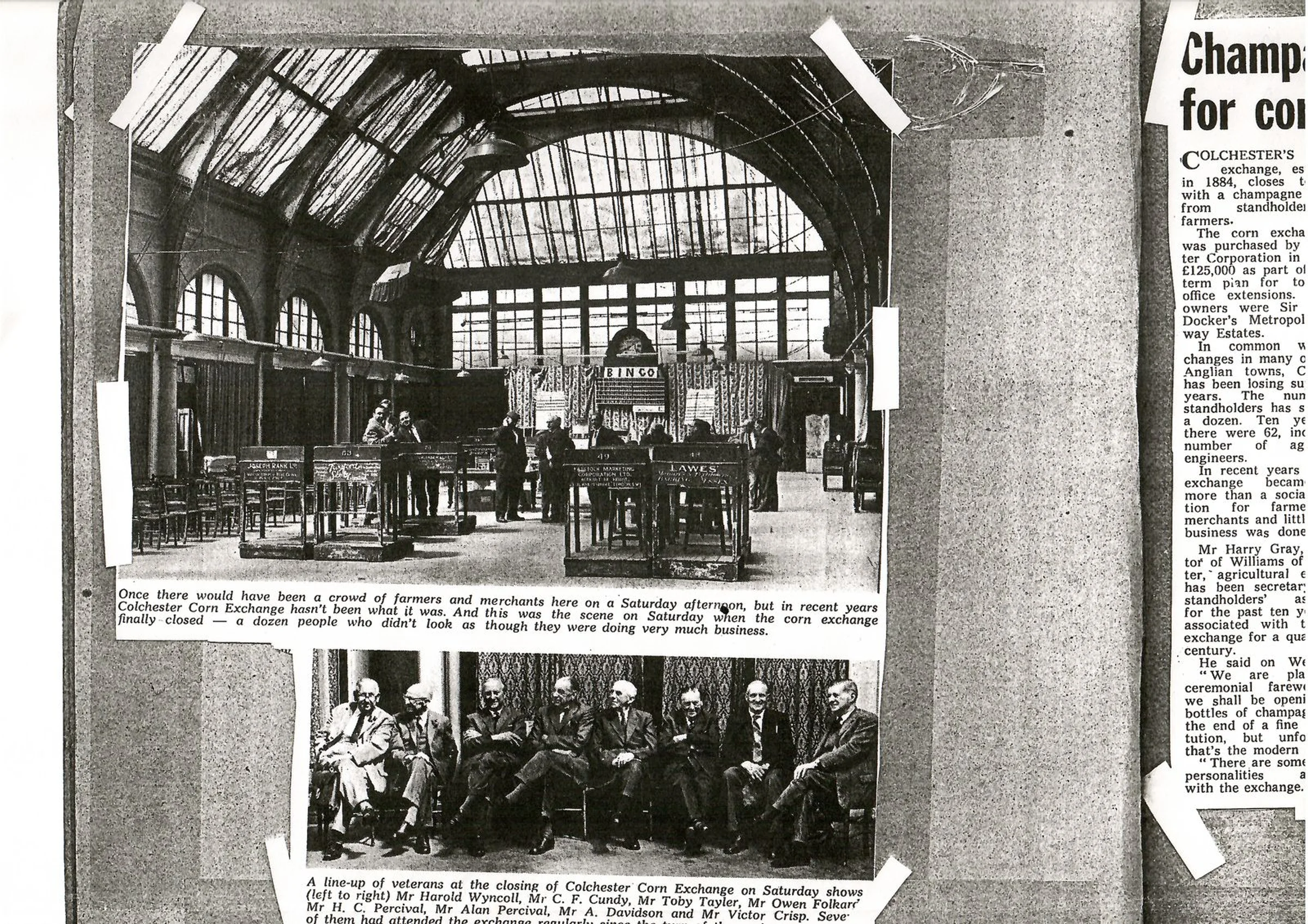 Undated images of the closing of the Colchester Corn Exchange. The original building in the High St became the Albert Hall in 1884 and is still there. The Corn Exchange must have moved elsewhere as these photos were taken much later than 1884.