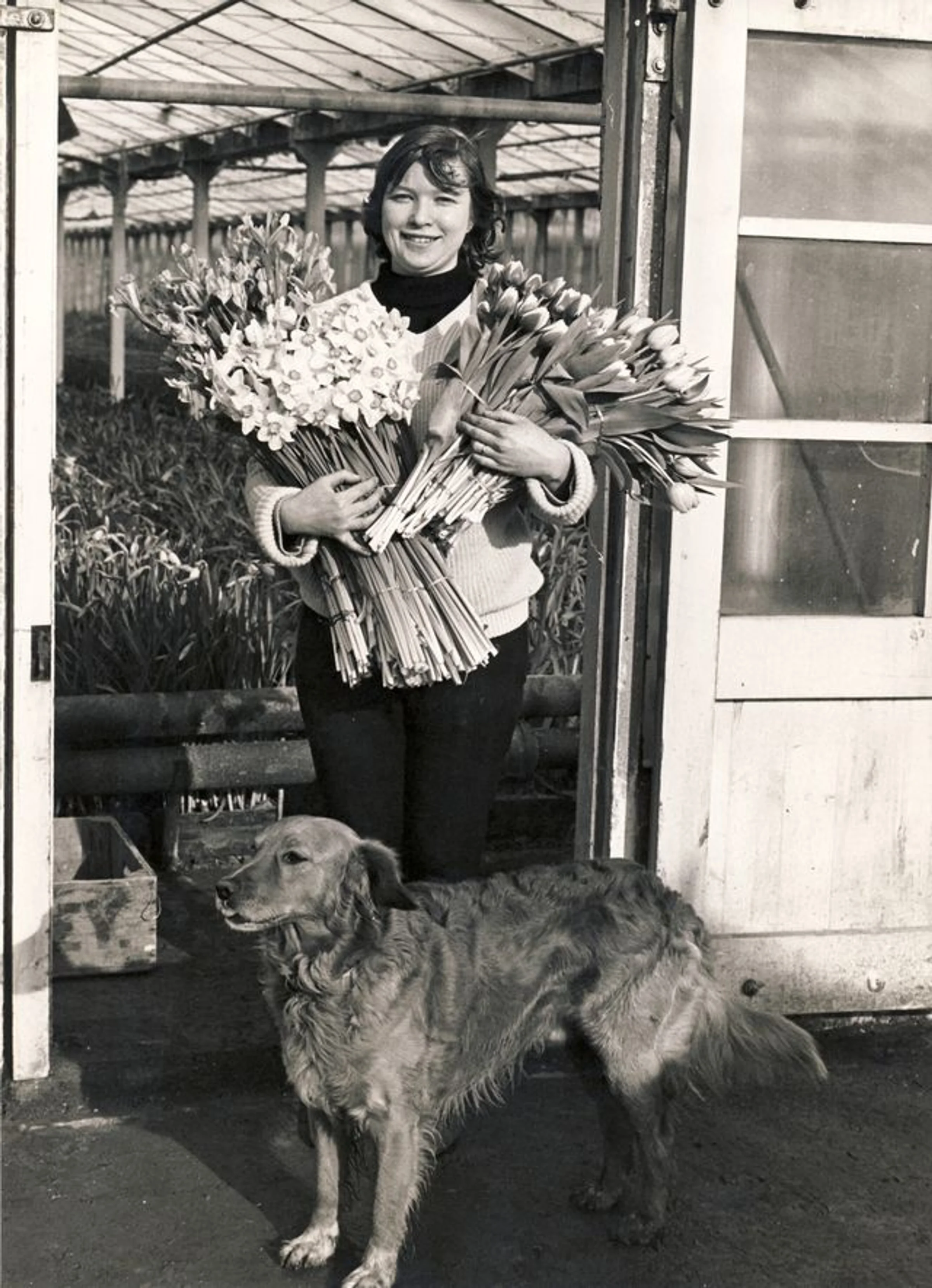 Pauline Mattin is standing at the doorway of a greenhouse at Tey Gardens holding an armful of daffodils and an armful of tulips. There is a dog waiting in front of her.